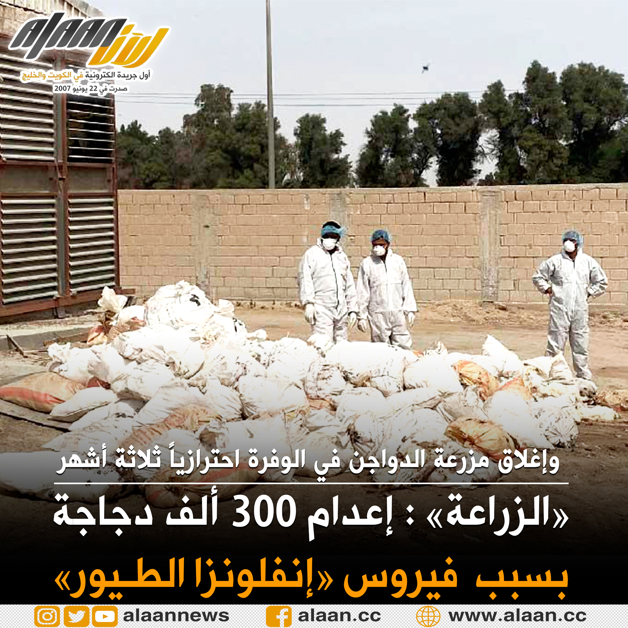 #الزراعة: 300 ألف دجاجة حصدتها #إنفلونزا_الطيور في #الوفرة -تم إقفال المزرعة احترازياً 3 أشهر لحين ارتفاع درجات الحرارة،التي ستقضي بدورها على المرض -الإصابات شملت 11 حظيرة للدواجن خلافاً للمزرعة الأخرى في #العبدلي