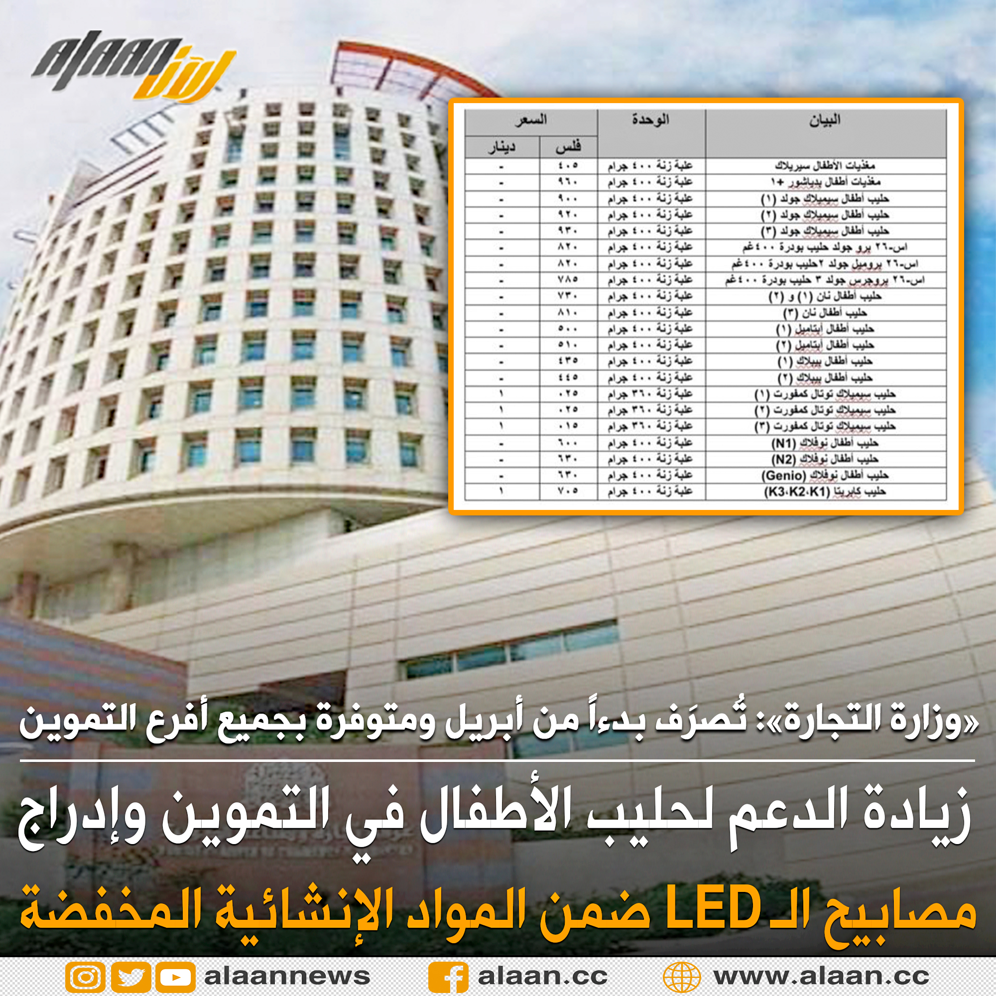 أعلنت وزارة التجارة والصناعة زيادة قيمة الدعم على مغذيات وحليب الأطفال تخفيفا على المواطنين، وإدراج المصابيح الموفرة للطاقة “LED” ضمن المواد الإنشائية المخفضة.