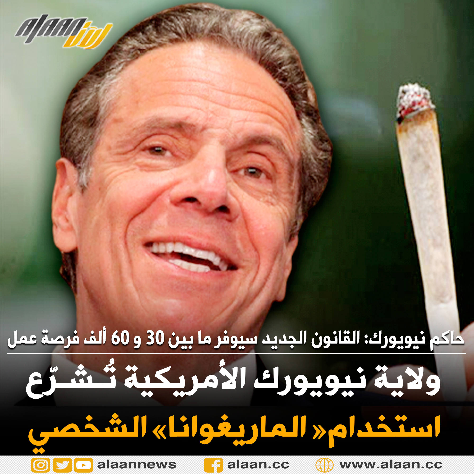 وقع حاكم ولاية #نيويورك #أندرو_كومو مشروع قانون يشرع تعاطي #الماريغوانا "مما يجعل نيويورك الولاية الأميركية الخامسة عشرة التي تضفي الشرعية على مبيعات الماريغوانا للبالغين"