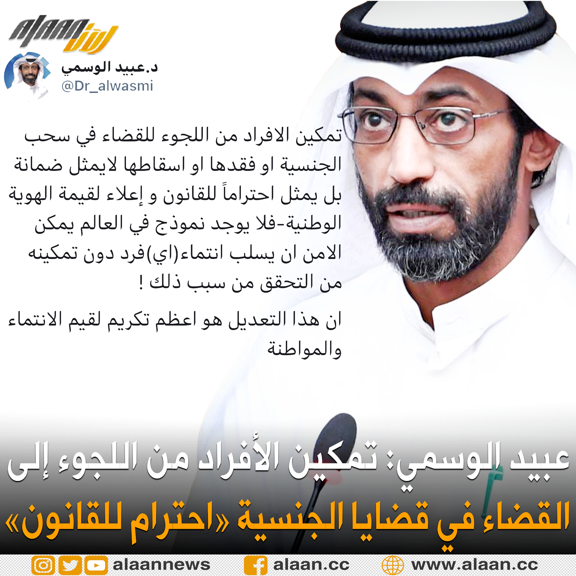 رأى النائب الدكتور عبيد الوسمي أن «تمكين الأفراد من اللجوء للقضاء في سحب الجنسية أو فقدها أو إسقاطها لا يمثل ضمانة بل يمثل احتراماً للقانون وإعلاء لقيمة الهوية الوطنية».