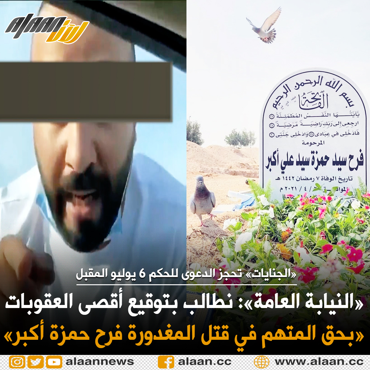 حجزت محكمة الجنايات قضية قتل فرح أكبر للحكم بجلسة 6 يوليو المقبل، في الجلسة التي شهدت مرافعة النيابة العامة.