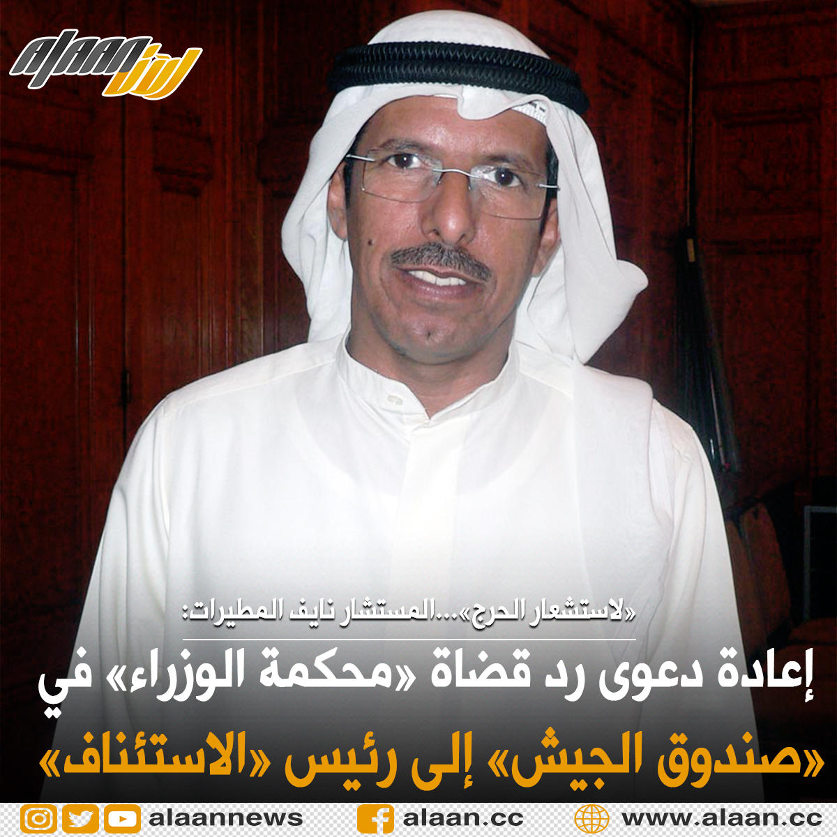 أعاد المستشار بوزارة العدل الكويتية نايف المطيرات دعوى رد هيئة قضاة محكمة الوزراء المقدمة من المتهمين في قضية صندوق الجيش إلى رئيس محكمة الاستئناف لاستشعار الحرج.