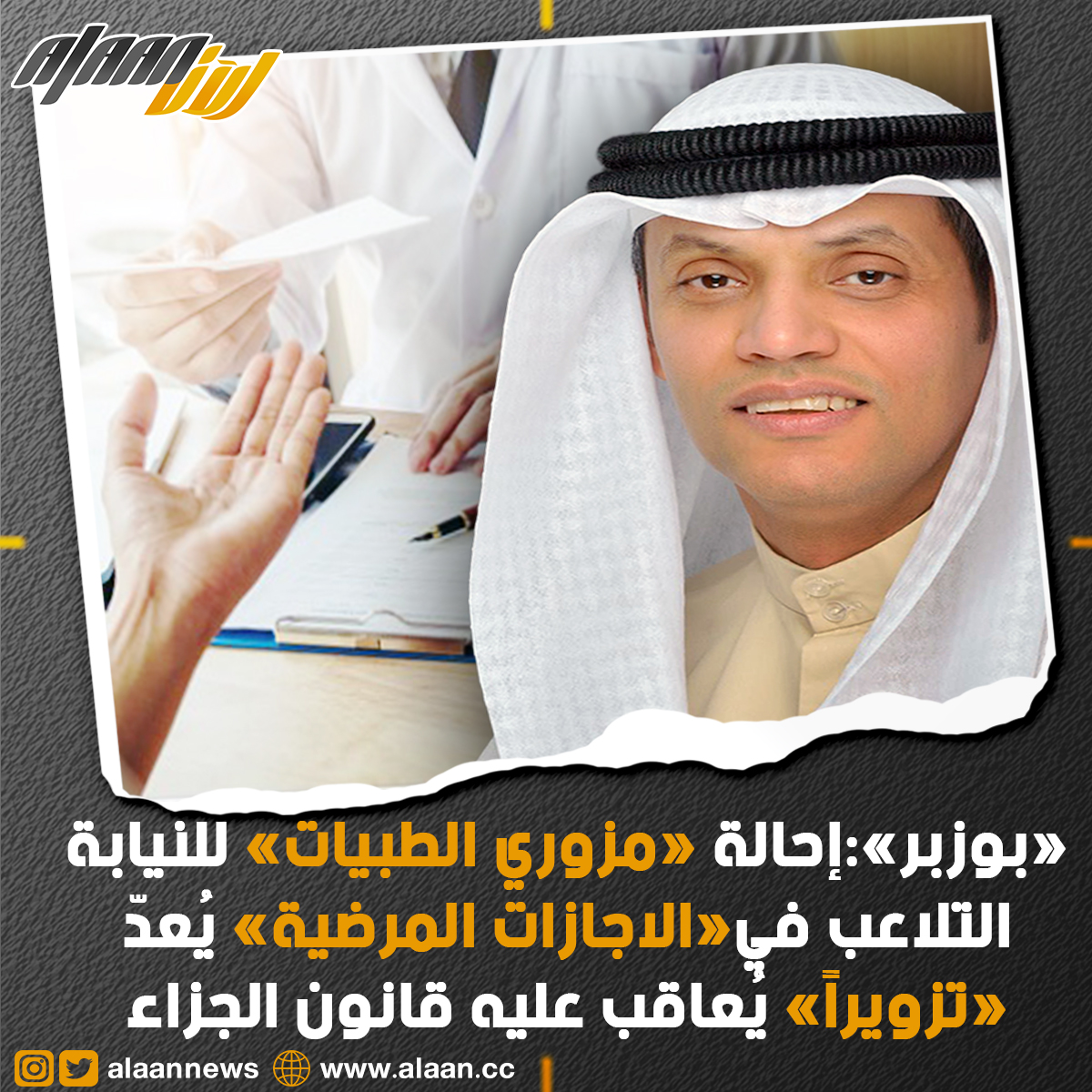 حذّر الأمين العام بالإنابة في الهيئة العامة لمكافحة الفساد «نزاهة» الدكتور محمد بوزبر من «التلاعب في الإجازات المرضية»، موضحاً أن «هذا التلاعب يُعدّ تزويراً يُعاقب عليه قانون الجزاء الكويتي».