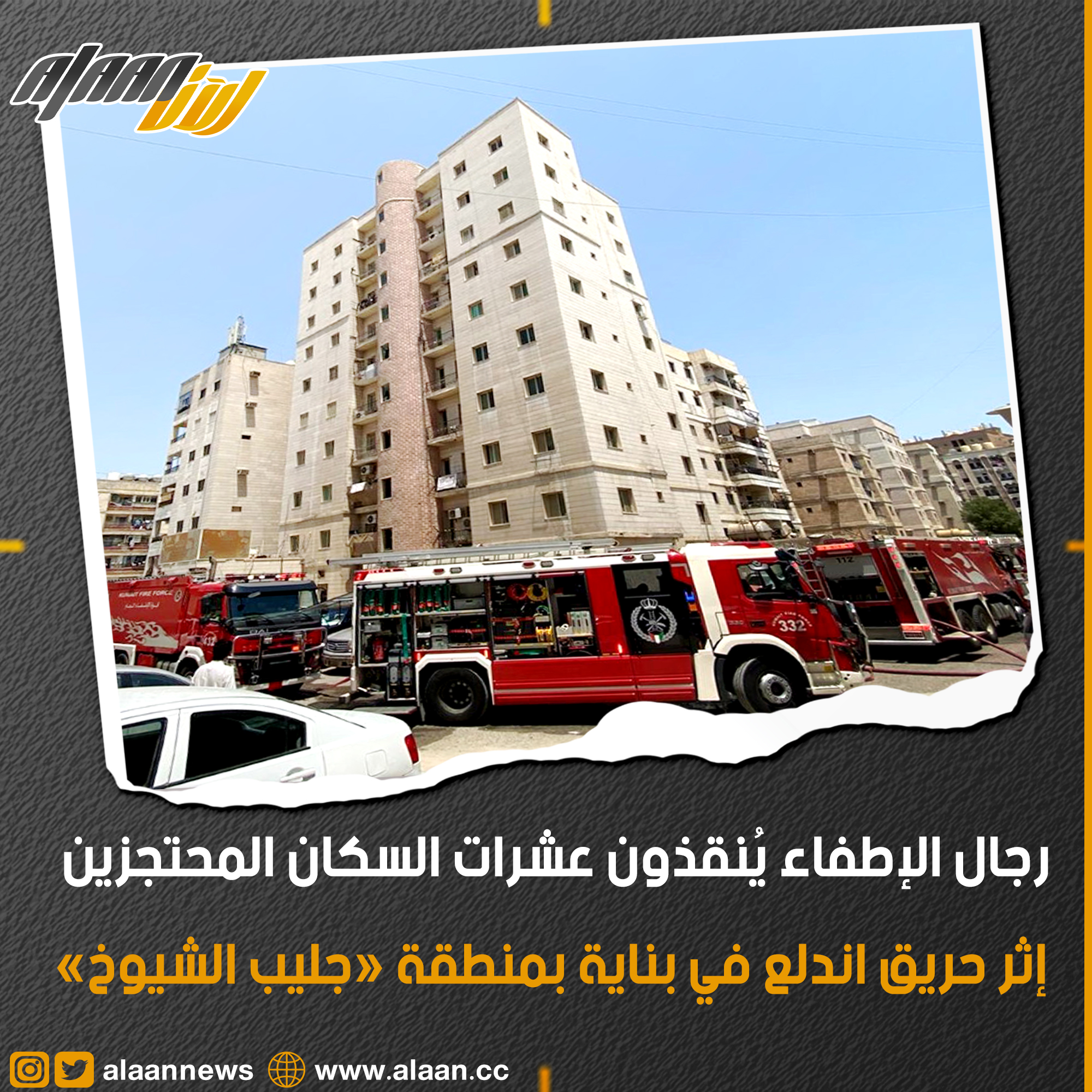 قالت قوة الإطفاء العام ان فرقها تمكنت من إنقاذ العشرات من السكان المحتجزين إثر حريق اندلع في بناية بمنطقة جليب الشيوخ اليوم الجمعة مؤكدة السيطرة على الحريق دون وقوع إصابات.