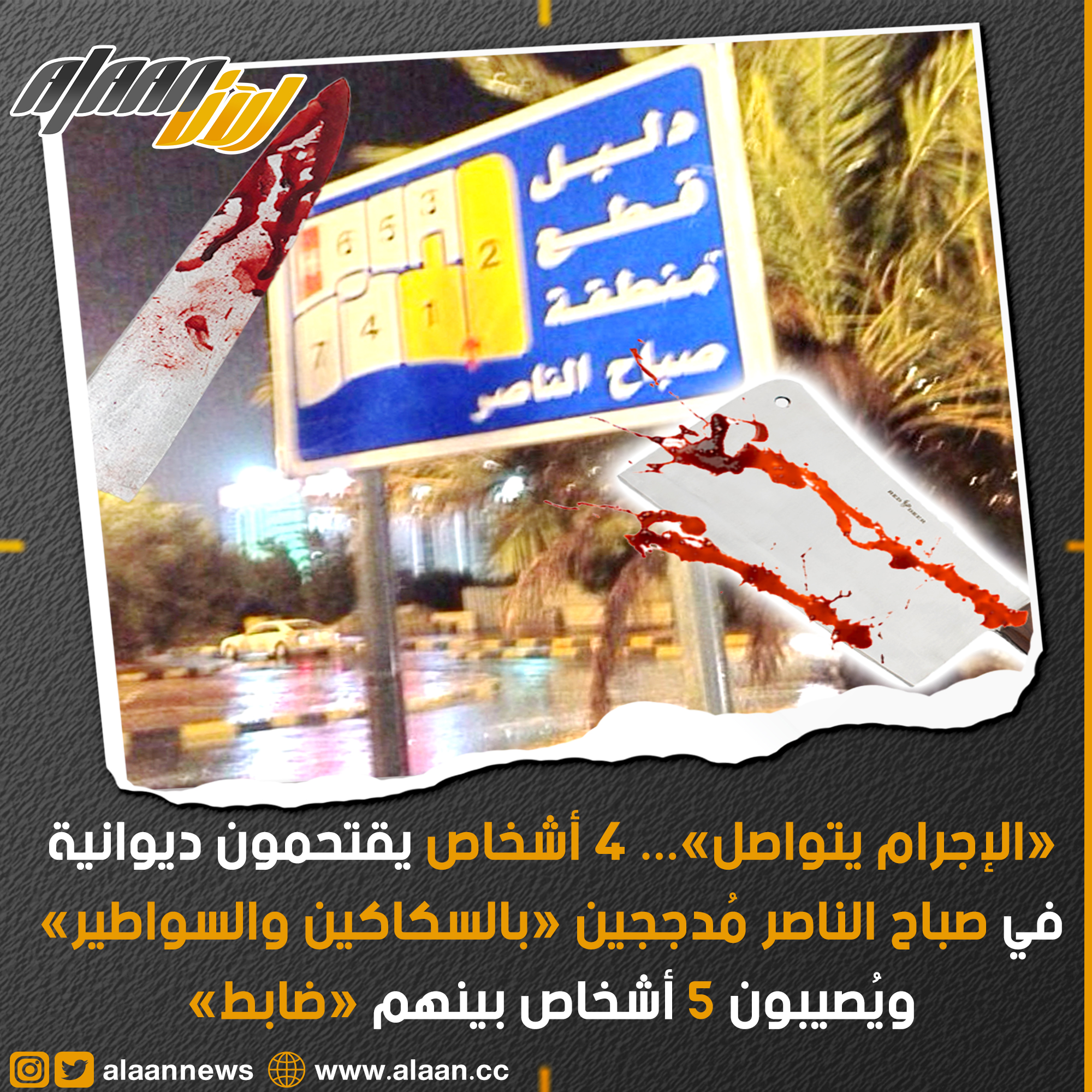 تلقت ادارة العمليات بلاغ إلى مخفر صباح الناصر عن اصابة 5 مواطنين بينهم «ضابط» في مشاجرة بعد اقتحام 4 أشخاص مسلحين بسواطير وسكاكين ديوانية لخلافات سابقة ونقل المصابين لمستشفى الفروانية