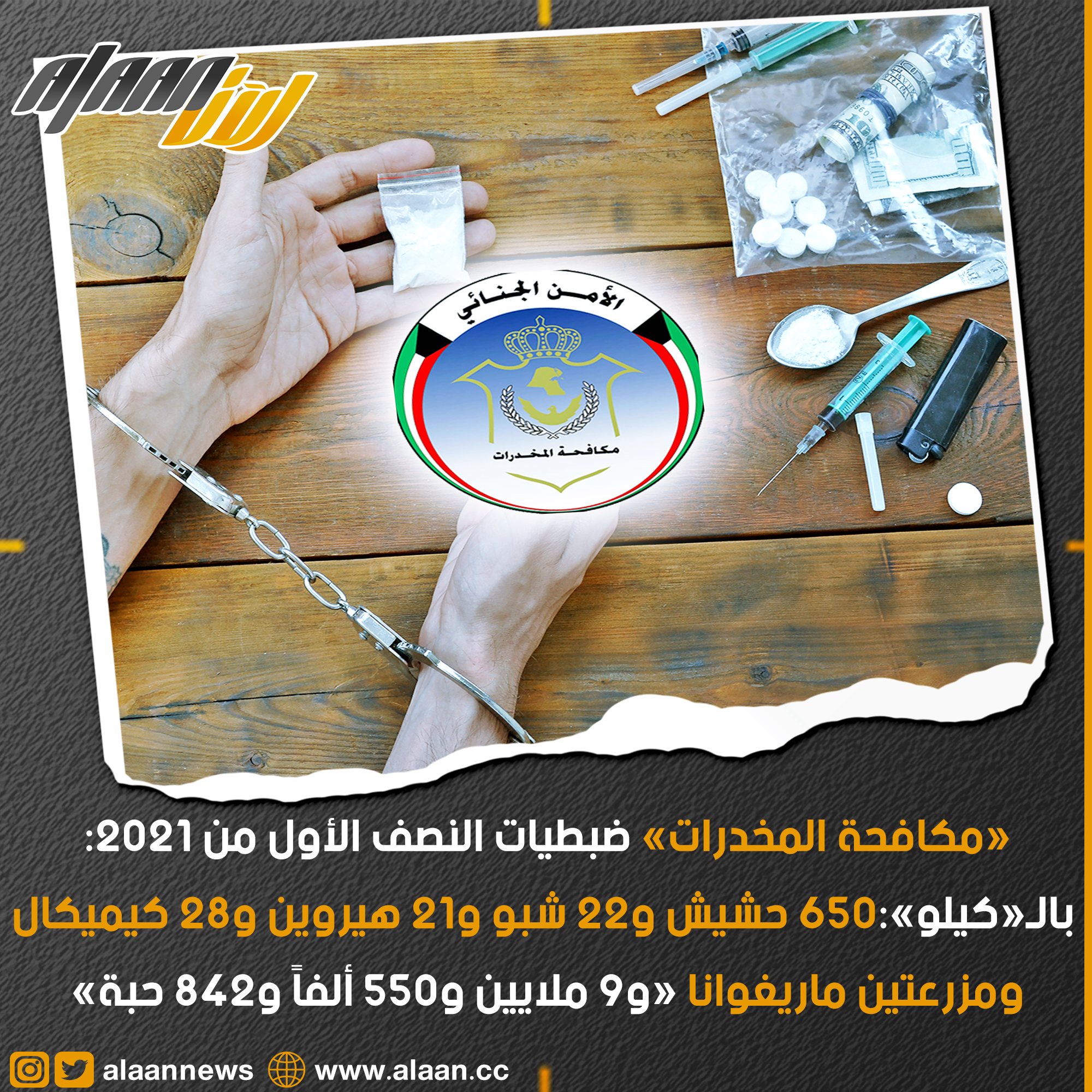 تمكنت الإدارة العامة لمكافحة المخدرات بدعم من الأجهزة الأمنية المساندة خلال الفترة من 1 يناير 2021 وحتى 31 مايو 2021، من ضبط 650 كيلو و10 غرامات «حشيش»، و22 كيلو و831 غراماً «شبو»، و21 كيلو و831 «هيروين»، و32 كيلو و739 «ماريغوانا»، و28 كيلو و646 «كيميكال»، 259 كيلو «خام» من مادة «الكيميكال»، 5659 غراماً «كوكايين»، و9 ملايين 5509 ألفاً و842 حبة مؤثرات عقلية، و183 زجاجة خمور.