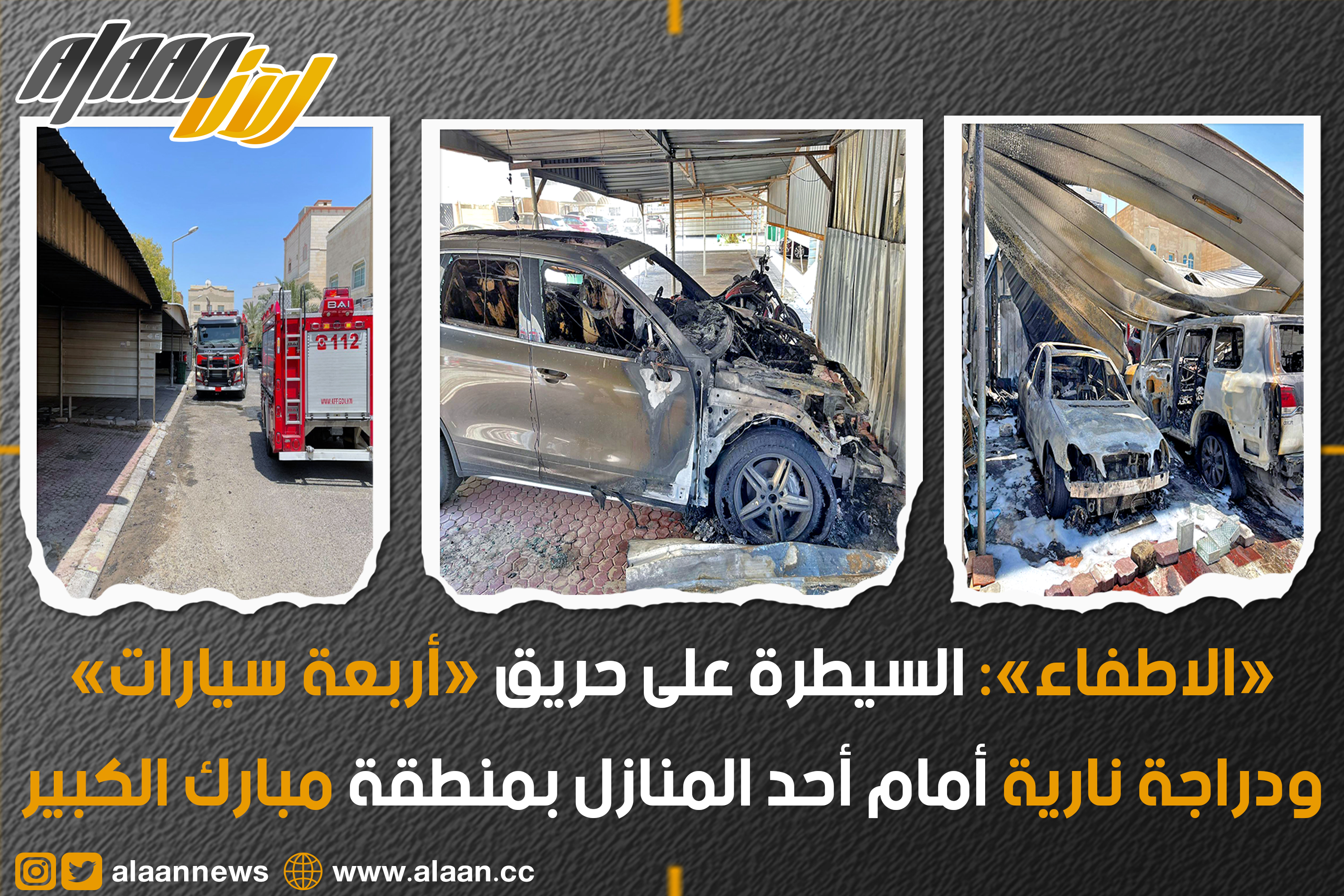 تمكن الإطفائيون من السيطرة على حريق نشب في 4 سيارات ودراجة نارية أمام أحد المنازل بمنطقة مبارك الكبير ظهر اليوم الثلاثاء.
