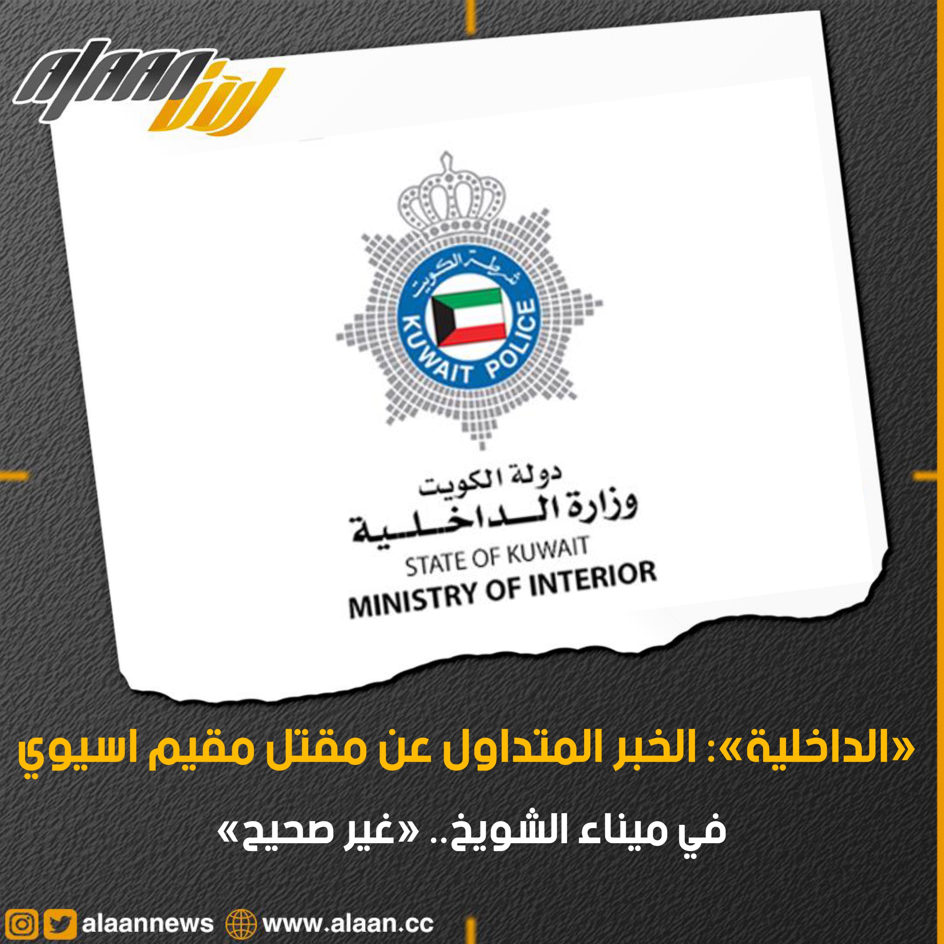 نفت وزارة الداخلية اليوم الأربعاء، في تصريح لها الخبر المتداول عن مقتل مقيم من جنسية آسيوية في ميناء الشويخ.