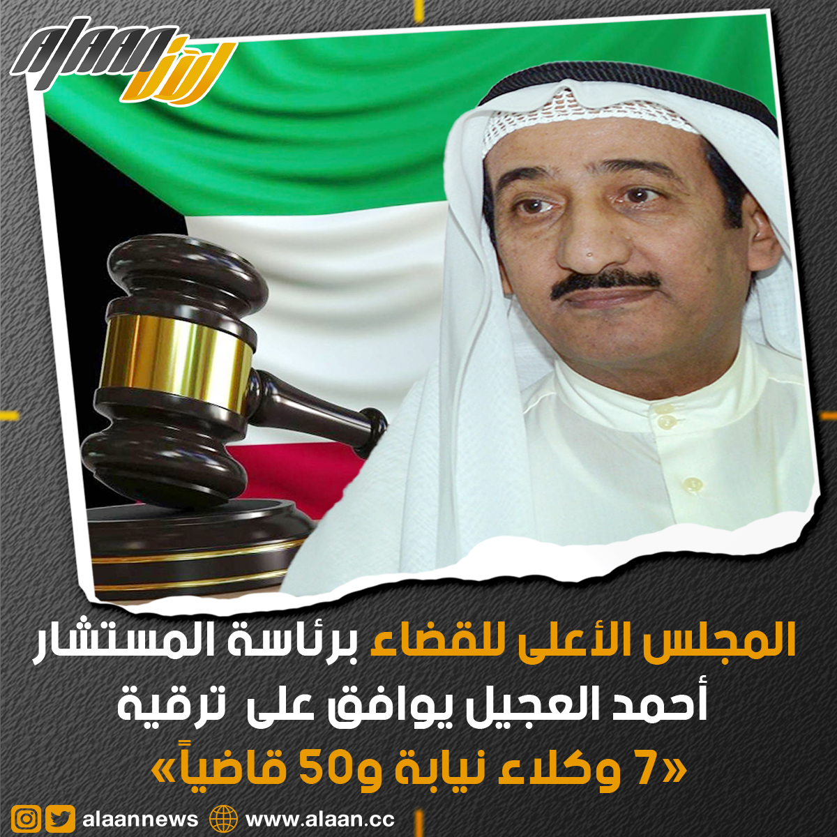وافق المجلس الأعلى للقضاء برئاسة المستشار أحمد العجيل على ترقية 7 وكلاء نيابة و50 قاضياً، وذلك تمهيداً لاستصدار المرسوم الأميري.