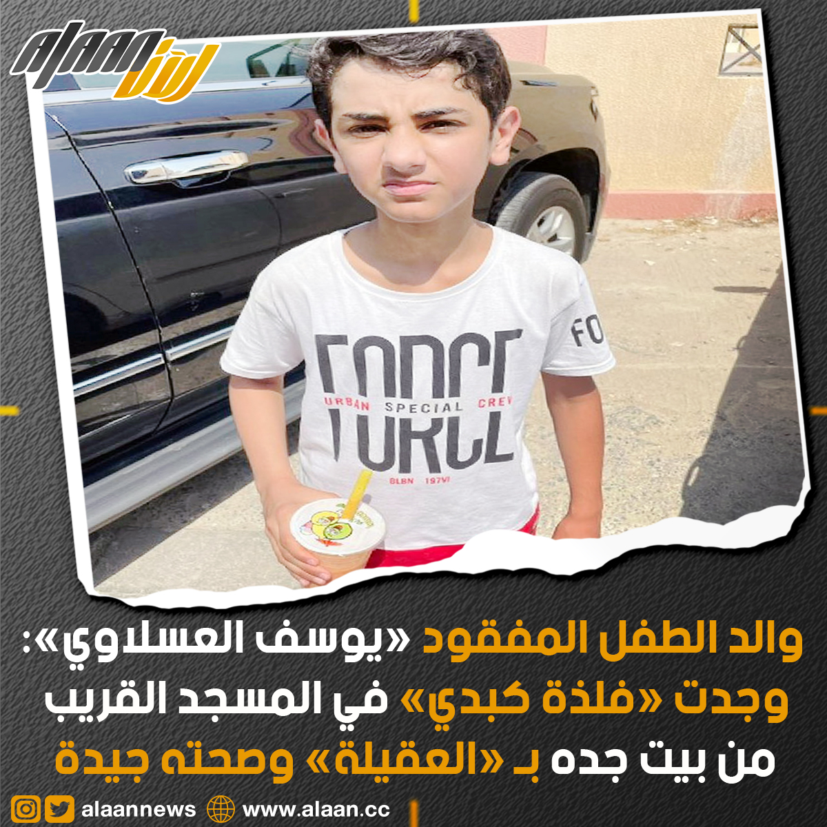أكد والد الطفل المفقود يوسف العسلاوي العثور على ابنه بصحة جيدة، موضحا ل انه عثر عليه امس في المسجد القريب من بيت جده بمنطقة العقيلة، شاكرا كل من تفاعل مع فقدانه والبحث عنه.