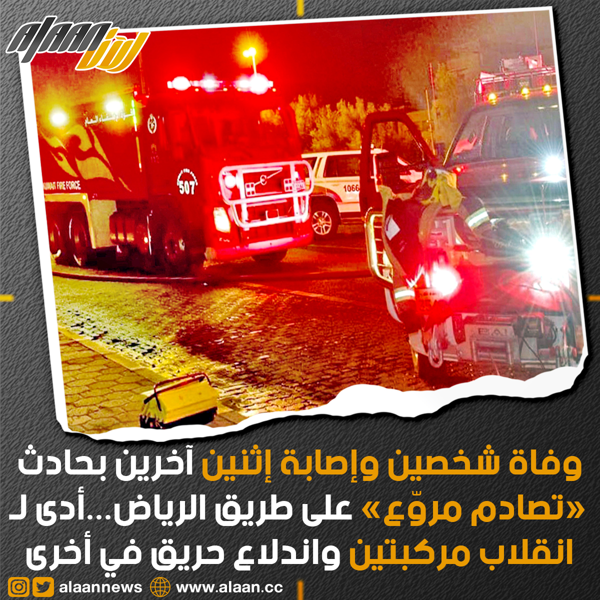 قالت إدارة العلاقات العامة والإعلام في قوة الإطفاء العام إن حادث تصادم مروّع وقع بين ثلاث مركبات على طريق الرياض الفاصل بين منطقتي قرطبة واليرموك مساء يوم أمس الخميس.