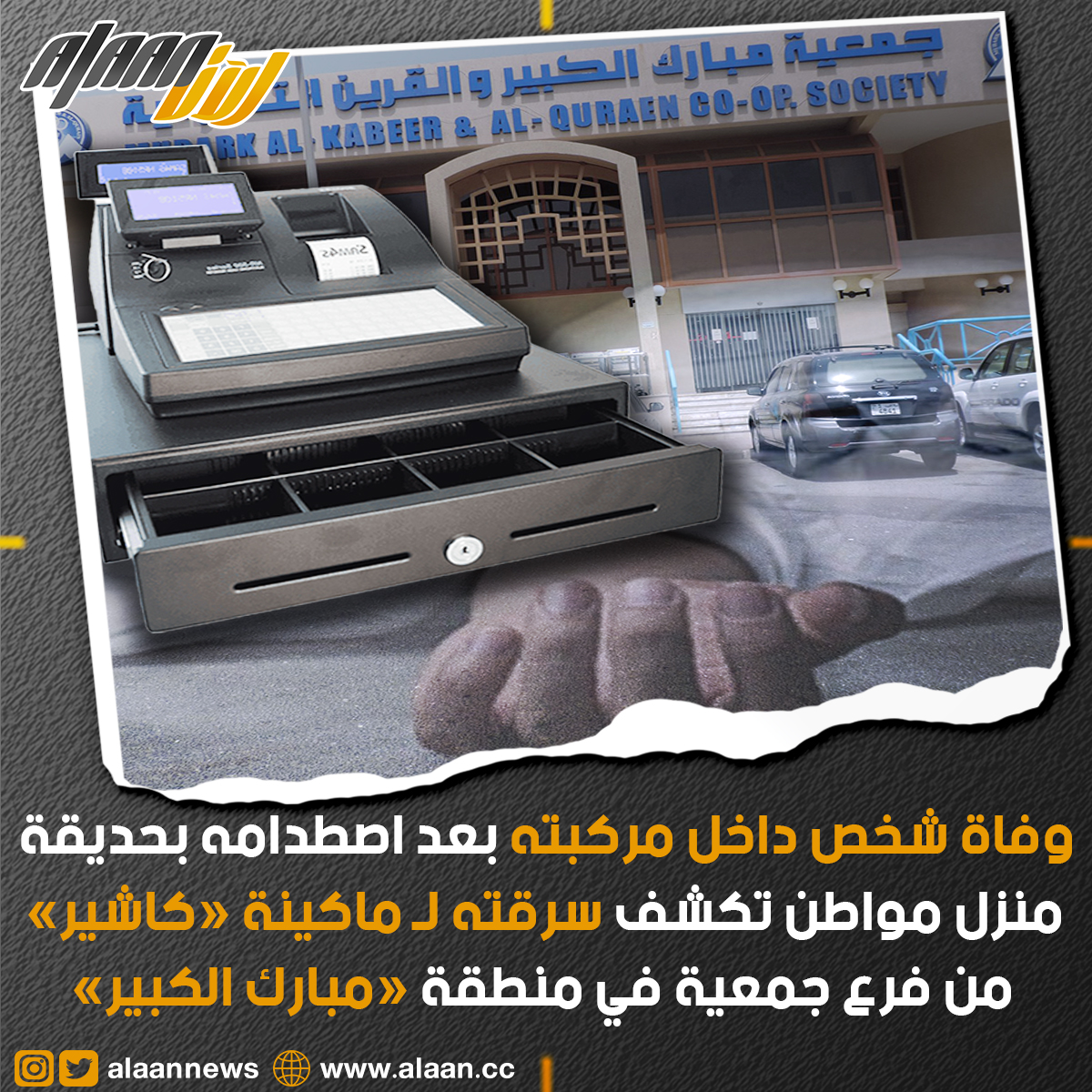 فقد ورد بلاغ من أحد المواطنين يفيد باصطدام سيارة في سور حديقته بمنطقه مبارك الكبير داخلها شخص فاقد الوعي؛ وعند انتقال رجال المخفر برفقتهم المباحث والأسعاف تبين أن قائدها فارق الحياة وعثر بداخلها على ماكينة «كاشير».