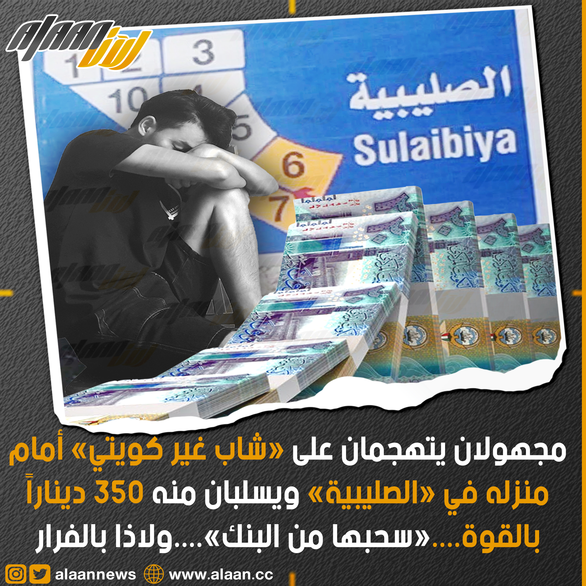 وأفاد مصدر أمني بأن «شاباً غير كويتي، تقدم إلى مخفر الصليبية، وأبلغ رجال الأمن بأنه كان جالساً أمام منزله في المنطقة ذاتها، وبحوزته مبلغ 350 ديناراً كان قد سحبها من البنك، إلا أنه تفاجأ بشخصين لا يعرفهما هجما عليه وهو جالس، وقاما بضربه وسرقة الأموال التي كانت معه وهربا من المكان».