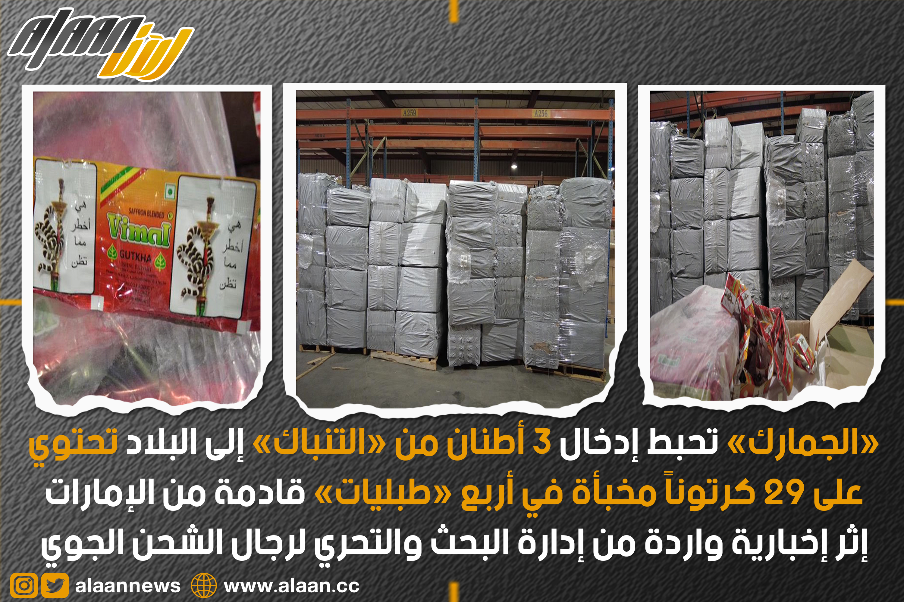 أحبط رجال الجمارك في إدارة البحث والتحري الجمركي الشحن الجوي محاولة إدخال ما يقارب 3 أطنان من مادة التنباك الممنوعة، كانت مخبأة في «طبليات» قادمة من الإمارات.