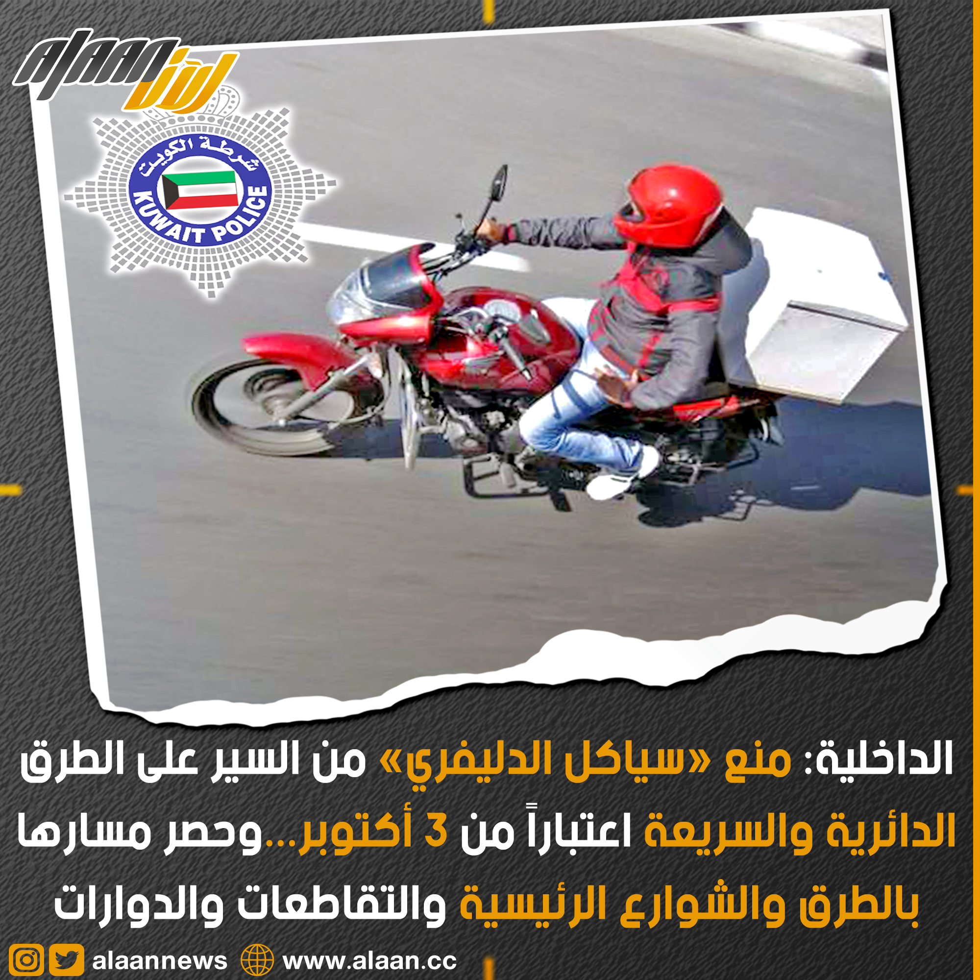 قال رئيس الاتحاد الكويتي لشركات توصيل الطلبات، إبراهيم عبدالله التويجري، إن الإدارة العامة للمرور ستمنع الدرجات الآلية الخاصة بتوصيل الطلبات (سياكل الدليفري) من السير على الطرق الدائرية والسريعة اعتبار من 3 أكتوبر المقبل، مثنياً على القرار لما فيه من الحفاظ على سلامة السائقين ومرتادي الطرق.
