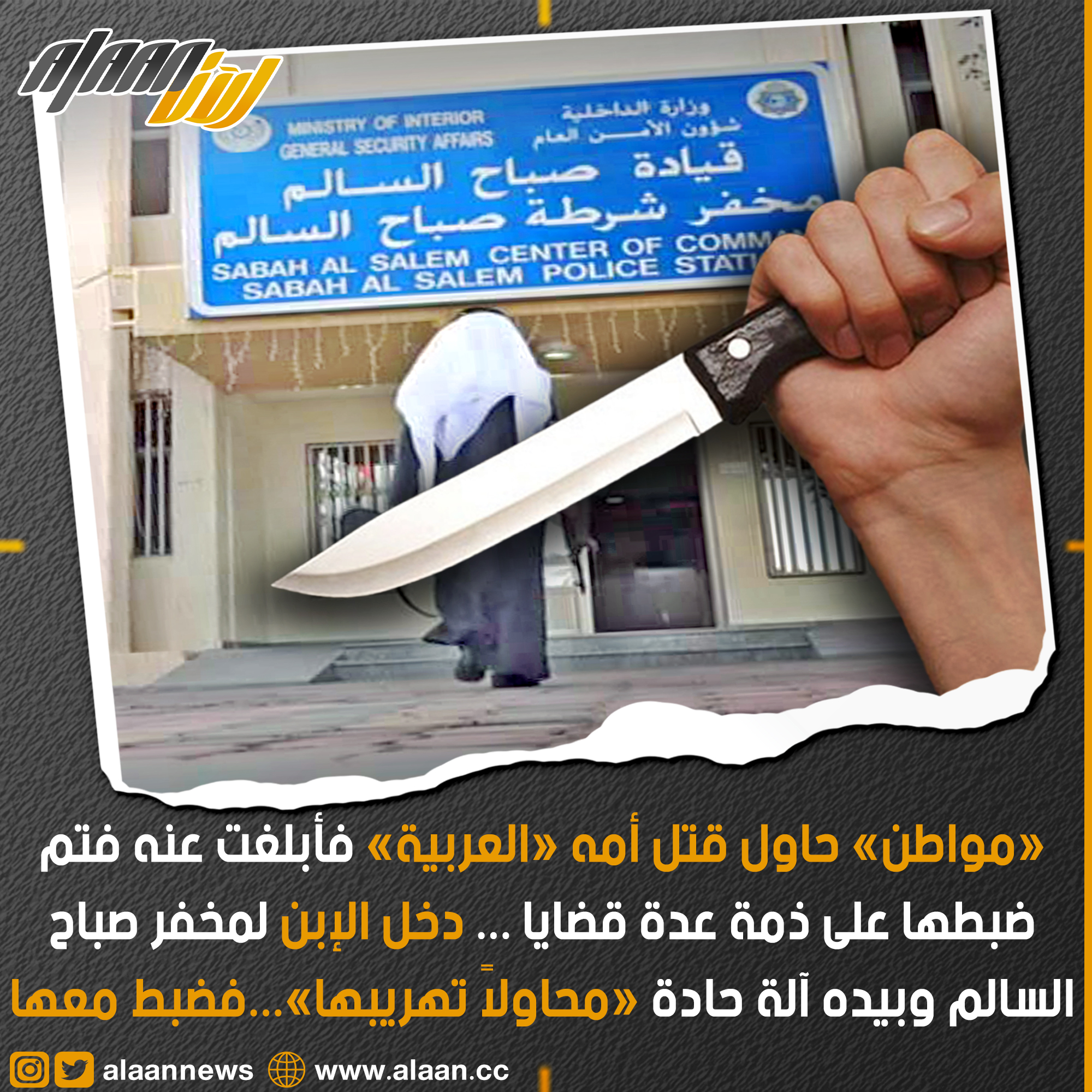 وذكرت الإدارة العامة للعلاقات والاعلام الامني بوزارة الداخلية أن بلاغاً ورد إلى غرفة العمليات من مخفر شرطة صباح السالم تحت مسمى «محاولة قتل»، وبانتقال قوة من المخفر إلى موقع البلاغ تمت مشاهدة المبلغة وهي مقيمة من جنسية عربية أفادت في أقوالها بأن ابنها المواطن هددها بالقتل بآلة حادة.