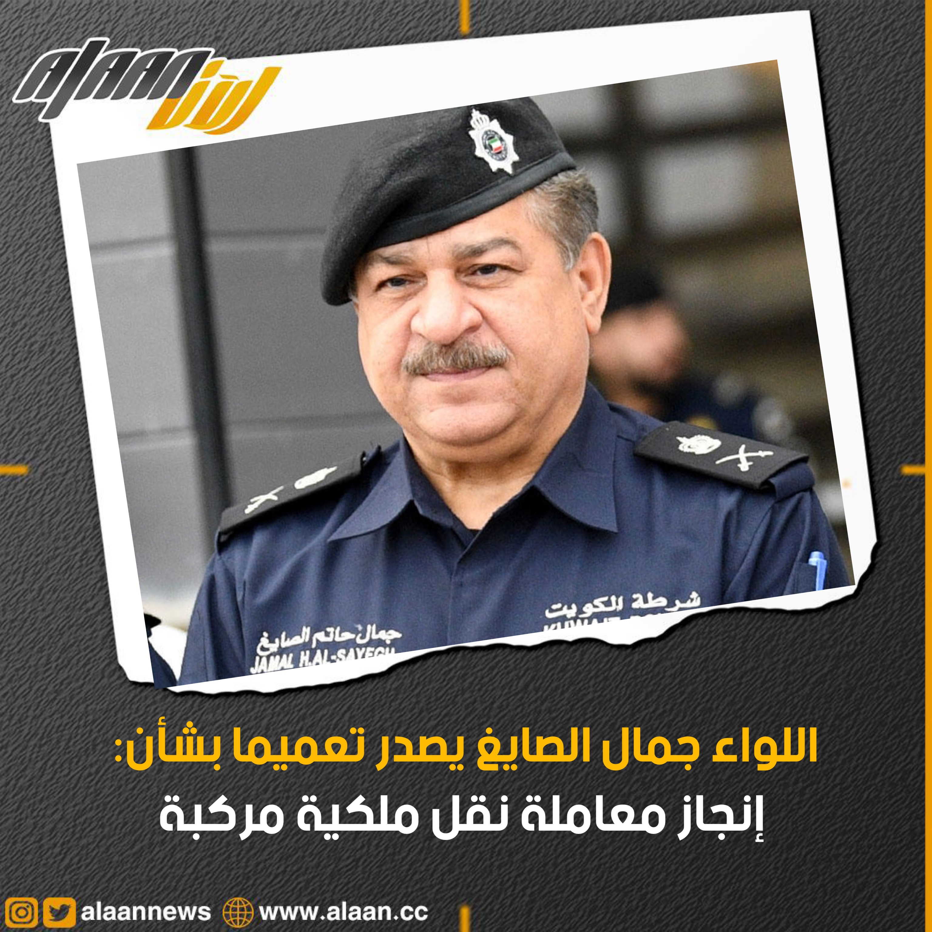 اللواء جمال الصايغ تعميمًا بشأن إنجاز معاملة نقل ملكية مركبة، وجاء نص التعميم كالتالي:-