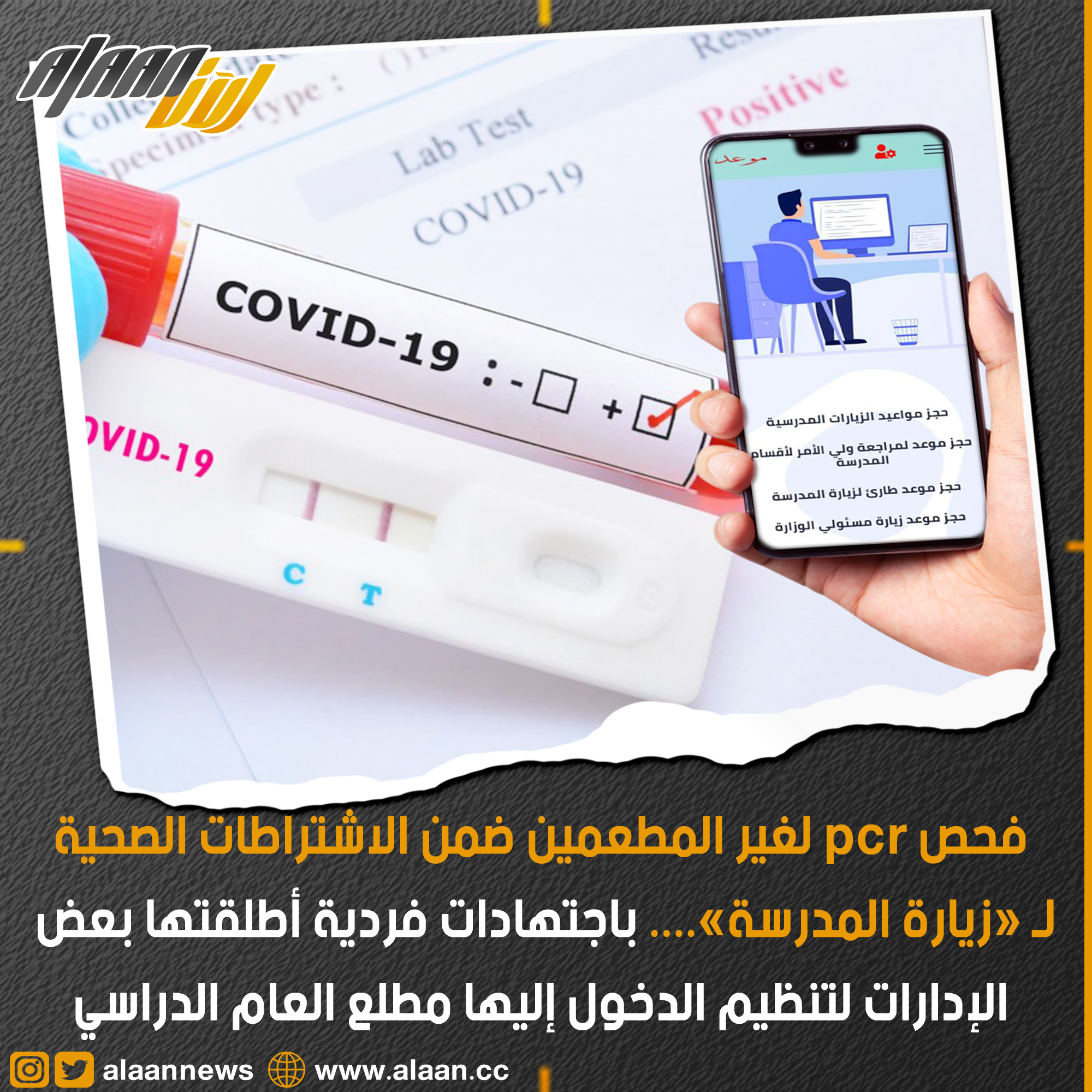 باجتهادات فردية، أطلقت بعض الإدارات المدرسية في مختلف المناطق التعليمية خدماتها الإلكترونية لأولياء الأمور بشأن حجز المواعيد المسبقة لزيارة المدرسة مطلع العام الدراسي 2021-2022، على أن يلتزم الزائر «ولي الأمر – مسؤول الوزارة» بالاشتراطات الصحية المطلوبة ومنها فحص الـ pcr إذا كان غير مطعم.