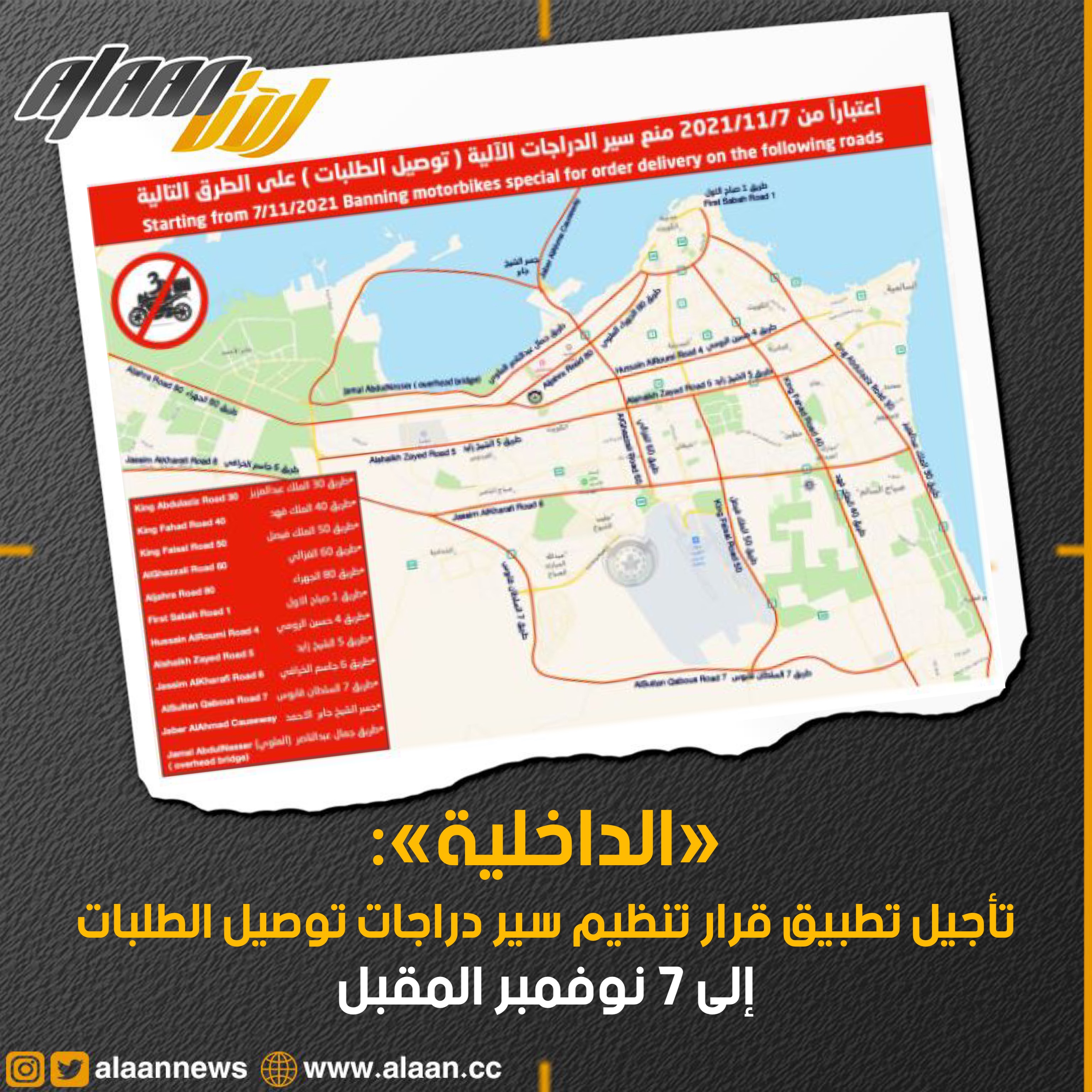 أعلنت الإدارة العامة للعلاقات والاعلام الأمني بوزارة الداخلية عن تأجيل موعد البدء في قرار تنظيم سير دراجات توصيل الطلبات حتى 2021/11/7.
