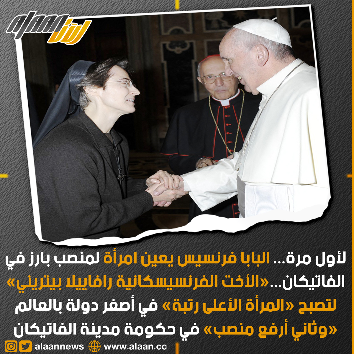 عيّن #البابا فرنسيس، الخميس، للمرة الأولى، امرأة على رأس حاكمية #الفاتيكان هي الأخت الفرنسيسكانية رافاييلا بيتريني، مؤكدا بذلك رغبته في الوصول الى مساواة أكبر في الكنيسة.(تخرجت في جامعة LUISS المشهورة لإدارة الأعمال)