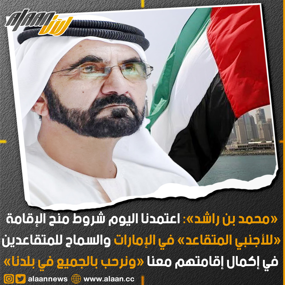 وأوضح صاحب السمو الشيخ محمد بن راشد آل مكتوم: «كما اعتمدنا اليوم شروط منح الإقامة للأجنبي المتقاعد. حيث يمكن للمتقاعدين إكمال إقامتهم معنا في دولة الإمارات .. نرحب بالجميع في بلدنا».