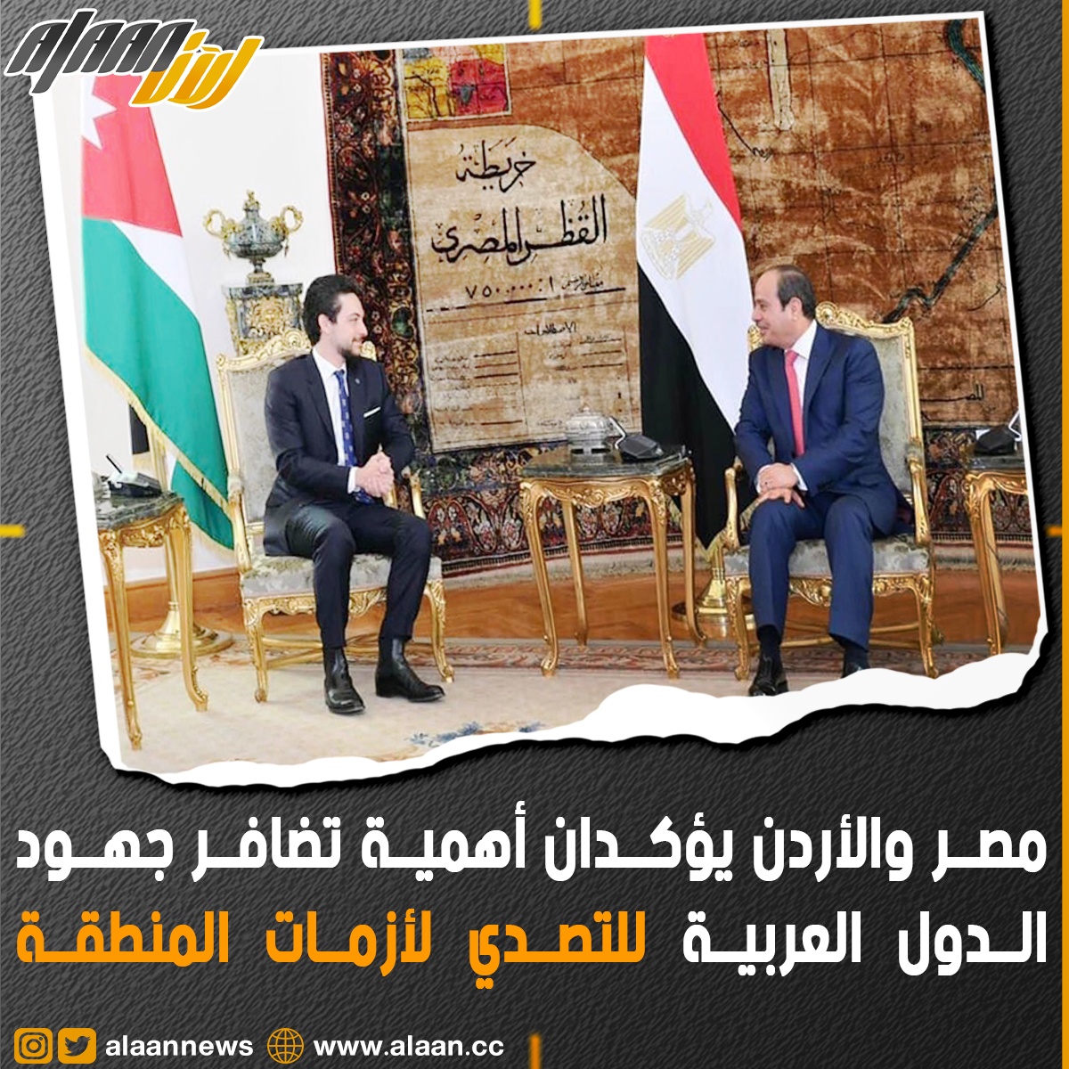 أكد الرئيس المصري عبدالفتاح السيسي وولي العهد الاردني الامير الحسين بن عبدالله اليوم الثلاثاء أهمية تكاتف وتضافر جهود الدول العربية للتصدي للأزمات القائمة ببعض دول المنطقة خاصة في ليبيا وسوريا وذلك في اطار احترام سيادتها ووحدتها.