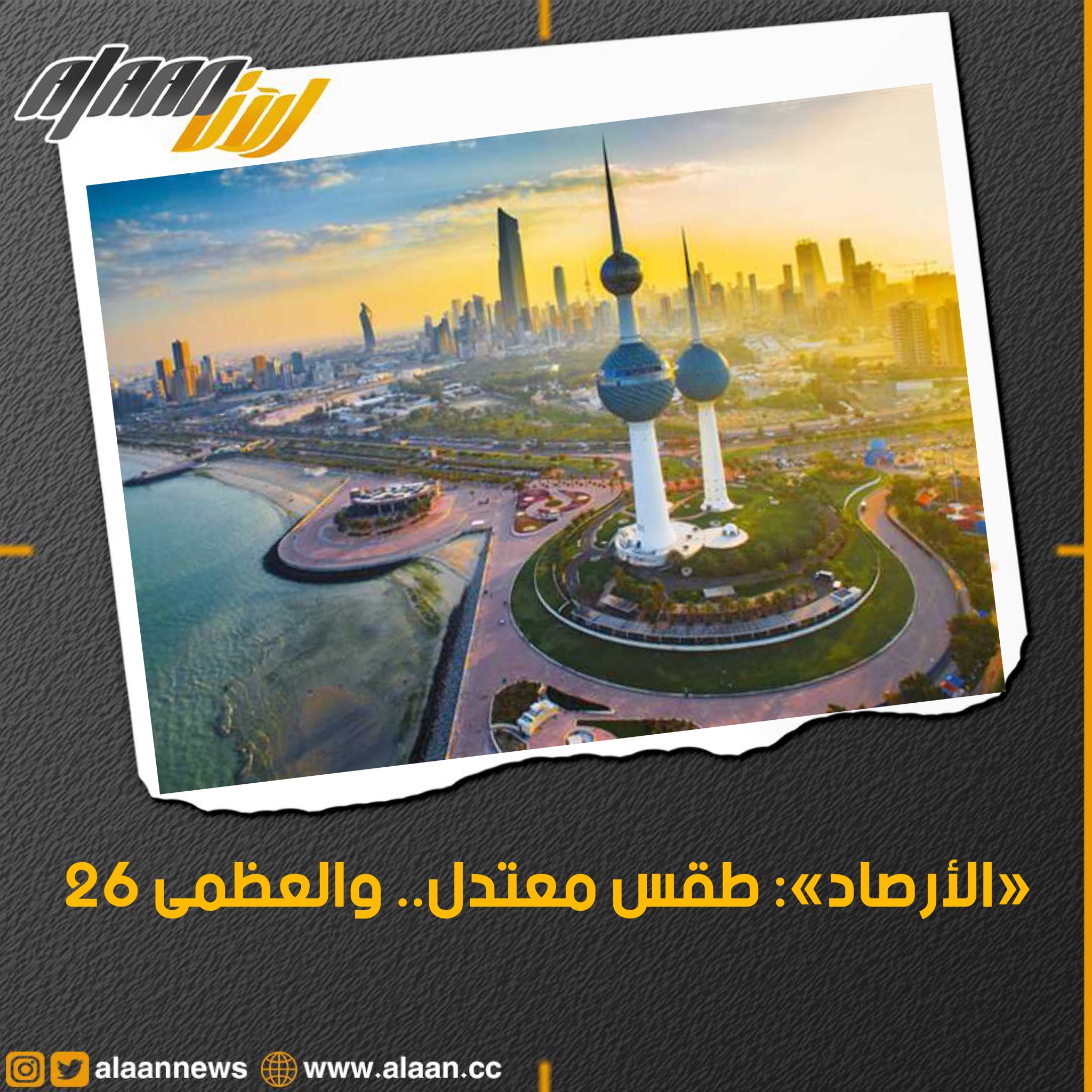 توقعت إدارة الأرصاد الجوية أن يسود طقس معتدل والرياح متقلبة الإتجاه إلى جنوبية شرقية خفيفة إلى معتدلة السرعة 06 - 28 كم/ساعة و تظهر بعض السحب المتفرقة، نهاراً.