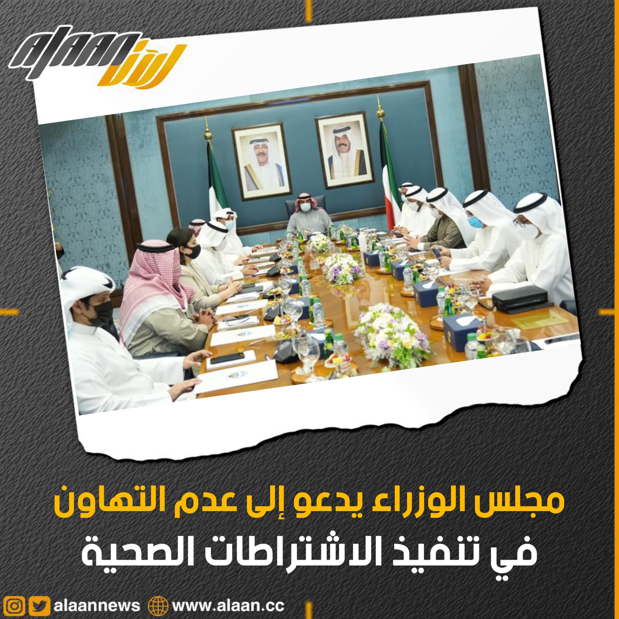 وفي الوقت الذي عبر فيه مجلس الوزراء عن ارتياحه لاستمرار استقرار الوضع الصحي في البلاد، فإنه يدعو المواطنين والمقيمين كافة إلى عدم التهاون في تنفيذ الاشتراطات الصحية، لاسيما لبس الكمام، مؤكداً على أهمية الحصول على الجرعة التنشيطية الثالثة من اللقاح للحماية من متحورات الفيروس حفاظاً على صحة الفرد والمجتمع، سائلاً المولى عز وجل السلامة للجميع وأن يحفظ الكويت ومن يعيش على أرضها والعالم كافة من كل سوء.