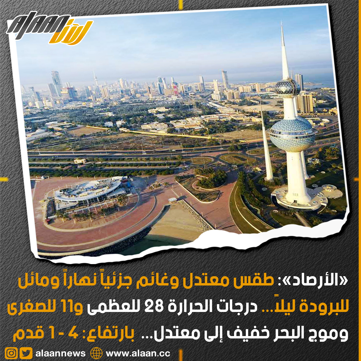 توقعت إدارة الأرصاد الجوية أن يسود اليوم طقس معتدل وغائم جزئياً، والرياح متقلبة الإتجاه إلى جنوبية شرقية خفيفة إلى معتدلة السرعة 08 - 30 كم/ساعة، وذلك خلال النهار.