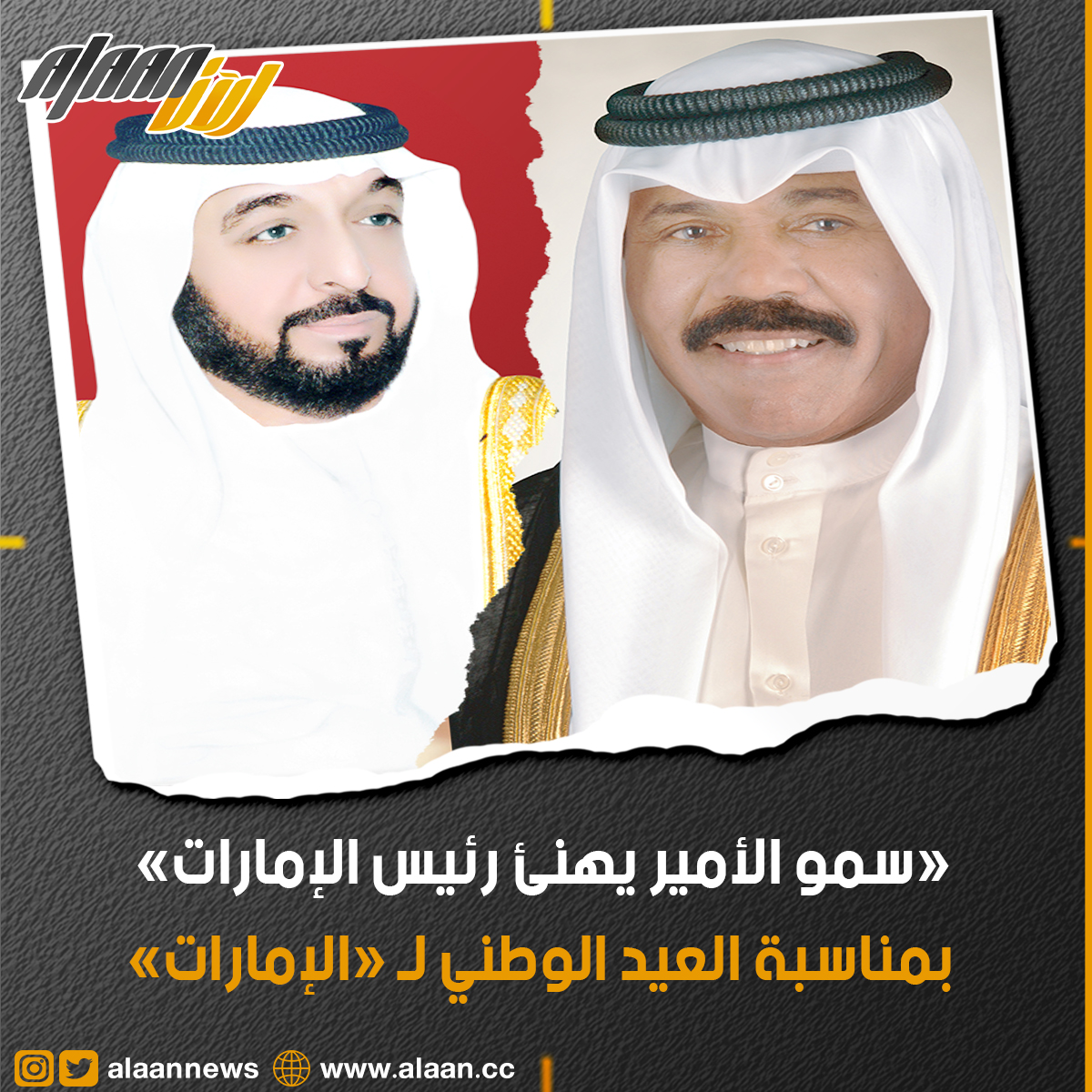 بعث سمو أمير البلاد الشيخ نواف الأحمد ببرقية تهنئة إلى رئيس دولة الإمارات العربية المتحدة سمو الشيخ خليفة بن زايد بن سلطان آل نهيان عبر فيها عن خالص تهانيه بمناسبة الذكرى الخمسين للعيد الوطني الإماراتي، مشيدا برسوخ أواصر العلاقات الأخوية الوطيدة والتاريخية التي تجمع دولة الكويت ودولة الإمارات وبما حققه البلد الشقيق من إنجازات حضارية على صعيد مساره التنموي الطموح والتي أسهمت في تعزيز مكانته المرموقة، ومتمنيا لسموه موفور الصحة والعافية ولدولة الإمارات وشعبها الكريم المزيد من التقدم والازدهار في ظل القيادة الحكيمة لسموه.