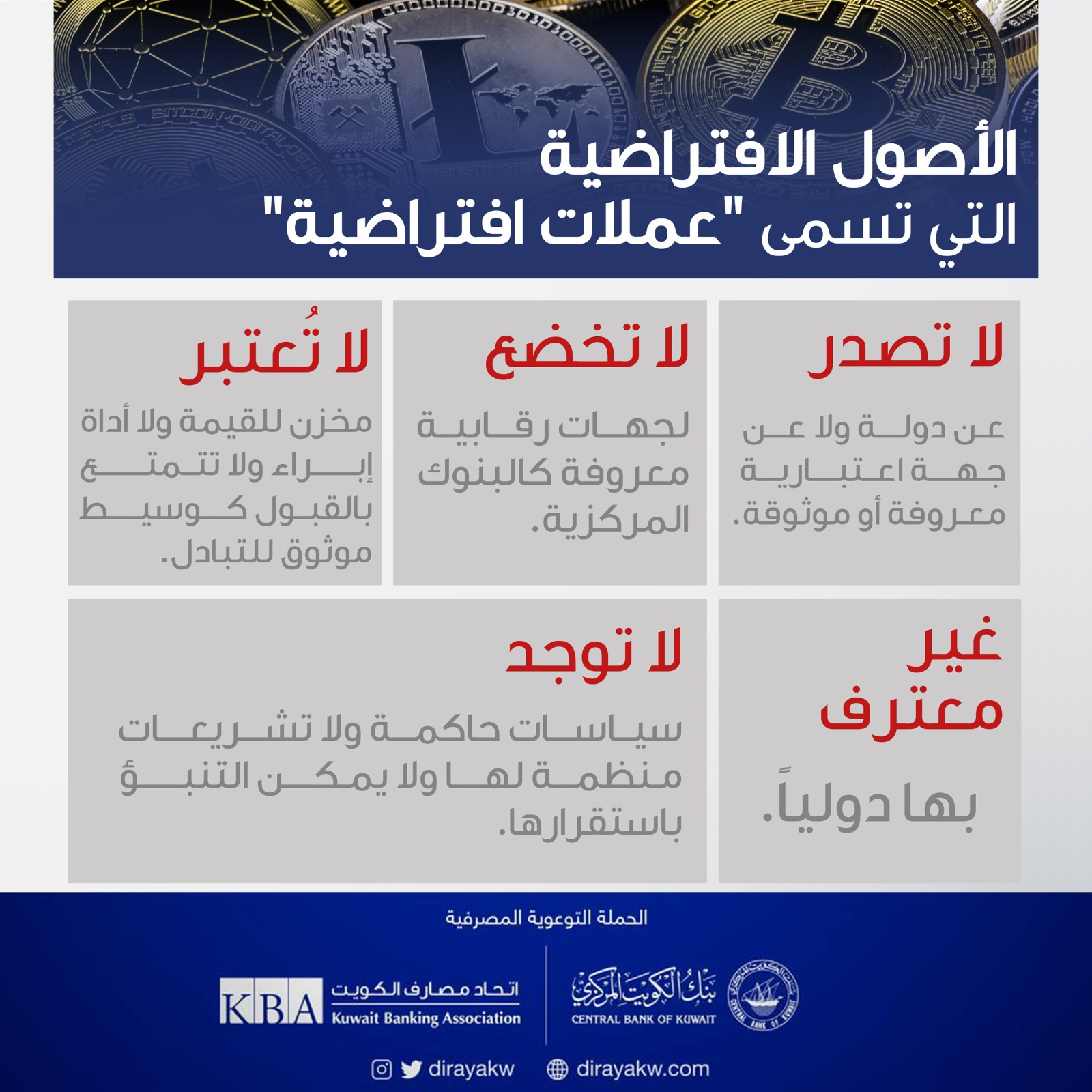 أكد بنك الكويت المركزي، اليوم الثلاثاء، أن الأصول الافتراضية، والتي تسمى «عملات افتراضية» لا تخضع لجهات رقابية، وغير معترف بها دولياً ولا تُعتبر أداة إبراء، فاحذر من التعامل بها».