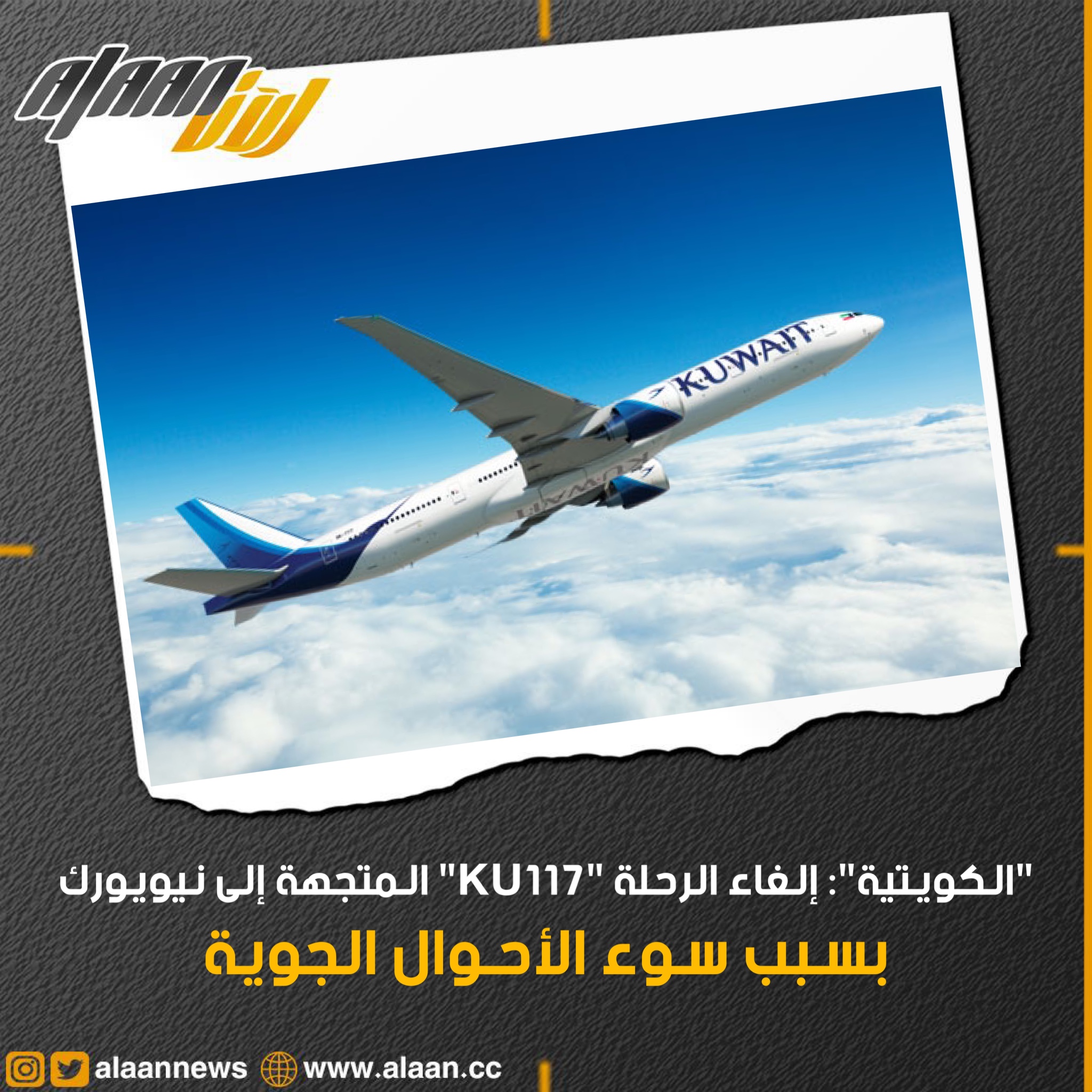 "الكويتية": إلغاء الرحلة "KU117" المتجهة إلى نيويورك غداً بسبب سوء الأحوال الجوية