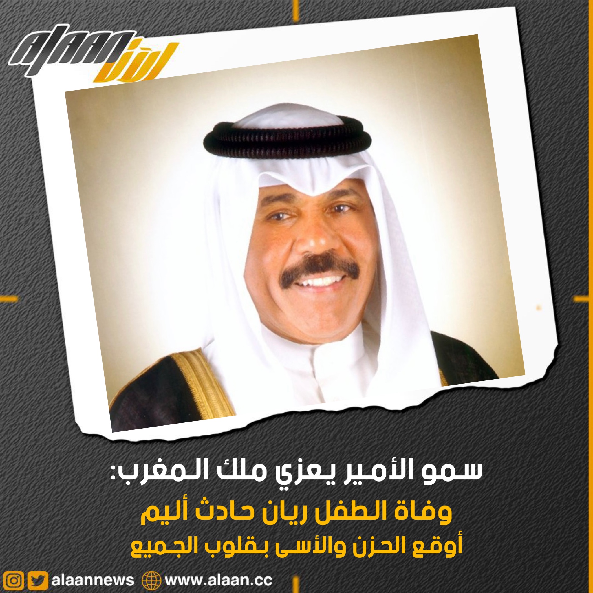 بعث حضرة صاحب السمو أمير البلاد الشيخ نواف الأحمد الجابر الصباح حفظه الله ورعاه ببرقية تعزية إلى أخيه صاحب الجلالة الملك محمد السادس ملك المملكة المغربية الشقيقة عبر فيها سموه حفظه الله عن خالص تعازيه وصادق مواساته لجلالته وللشعب المغربي الشقيق ولأسرة الطفل ريان خالد أورام الذي توفي إثر سقوطه في أحد الآبار بمدينة شفشاون في شمالي المغرب مشيرا سموه رعاه الله إلى أن هذا الحادث الأليم قد أوقع الحزن والأسى في قلوب الجميع سواء في المملكة المغربية الشقيقة أو خارجها سائلا سموه المولي تعالى أن يتغمده بواسع رحمته ويسكنه فسيح جناته وأن يلهم الجميع جميل الصبر وحسن العزاء.