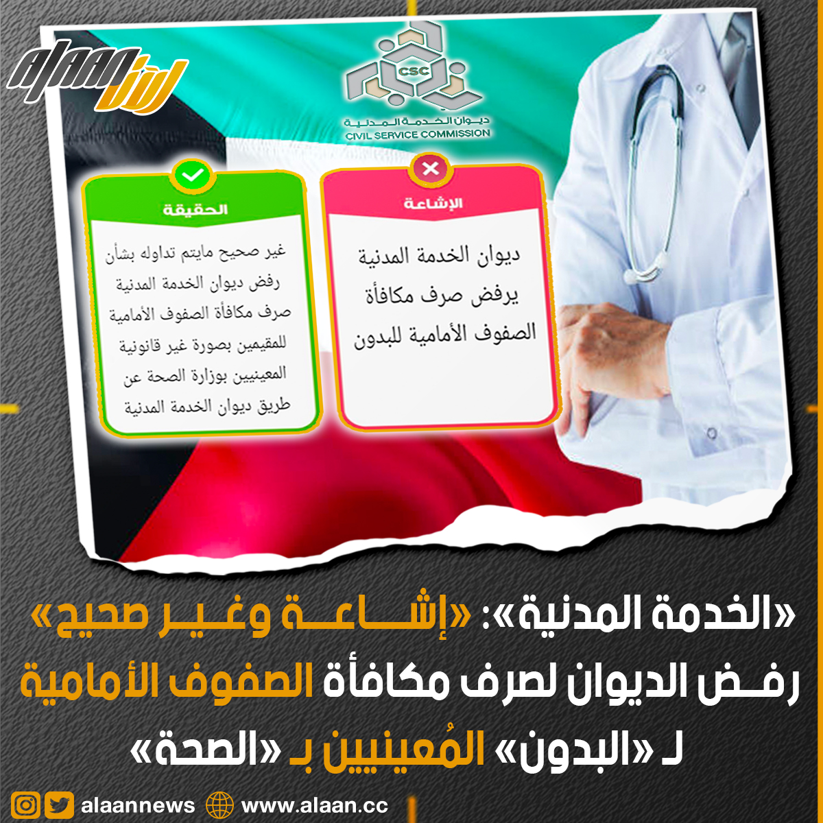 نفى ديوان الخدمة المدنية عبر صفحتهم الشخصية في تويتر بشأن الإشاعة التي تم تداولها بخصوص رفض الديوان لصرف مكافأة الصفوف الأمامية للمقيمين بصورة غير قانونية «البدون» . إذ أكد الديوان بأن هذه إشاعة لا صحة لها ولما تم تداوله حول رفض ديوان الخدمة المدنية لصرف المكافأة للبدون المعينيين بوزاة الصحة عن طريق الديوان