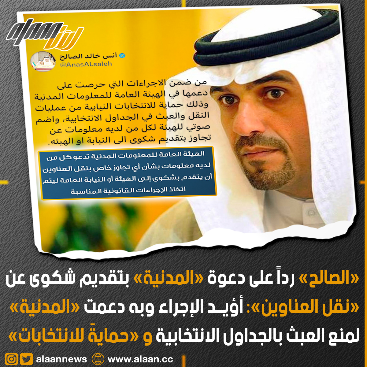 وقال الصالح في تغريدة عبر حسابه في موقع تويتر «من ضمن الاجراءات التي حرصت على دعمها في الهيئة العامة للمعلومات المدنية وذلك حماية للانتخابات النيابية من عمليات النقل والعبث في الجداول الانتخابية، واضم صوتي للهيئة لكل من لديه معلومات عن تجاوز بتقديم شكوى الى النيابة او الهيئه».