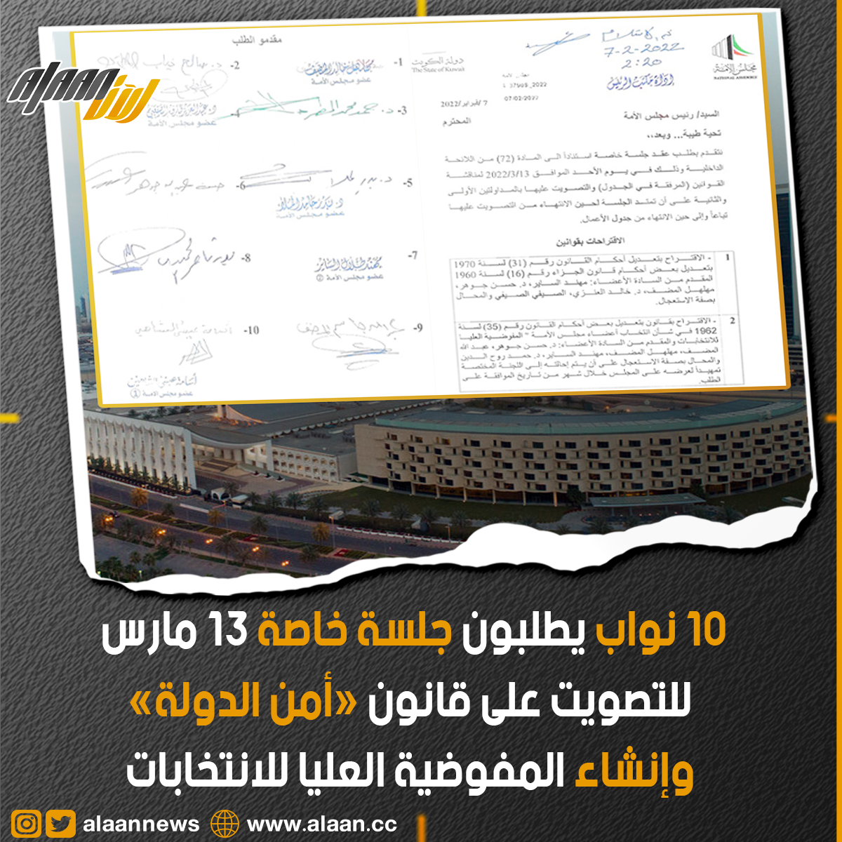 تقدم 10 نواب في مجلس الأمة بطلب عقد جلسة خاصة للتصويت على قانون أمن الدولة وإنشاء المفوضية العليا للانتخابات 13 مارس