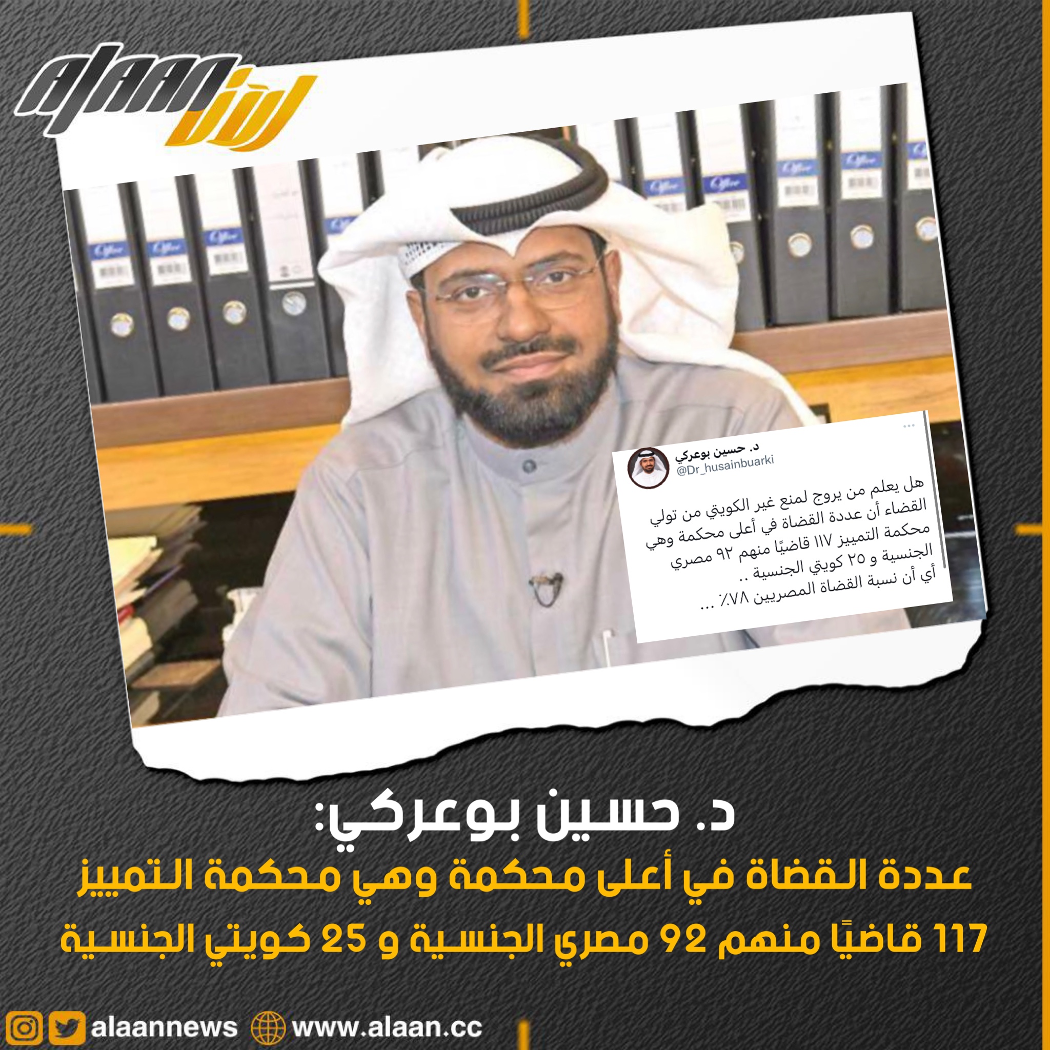 رئيس قسم القانون الجزائي بجامعة الكويت المحامي د.حسين بوعركي: عددة القضاة في أعلى محكمة وهي محكمة التمييز 117 قاضيًا منهم 92 مصري الجنسية و25 كويتي الجنسية أي أن نسبة القضاة المصريين 78%