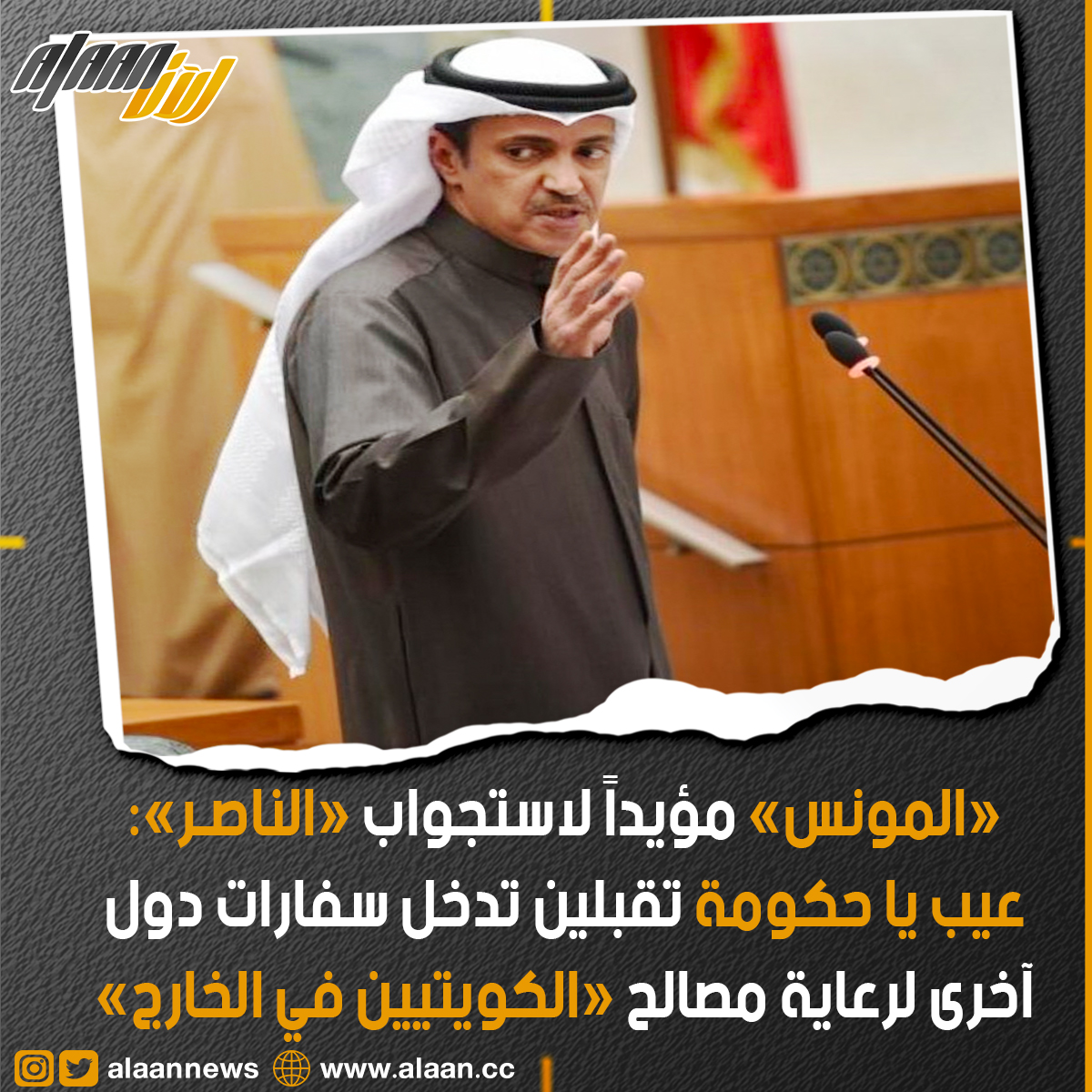 المونس مؤيدًا للاستجواب: هناك سفارات تتقاعس تجاه المواطنين عند تعرضهم لأي مشكلة في الخارج.. عيب على الحكومة ان تقبل بتدخل سفارة أي دولة في رعاية مصالح الكويتيين في الخارج