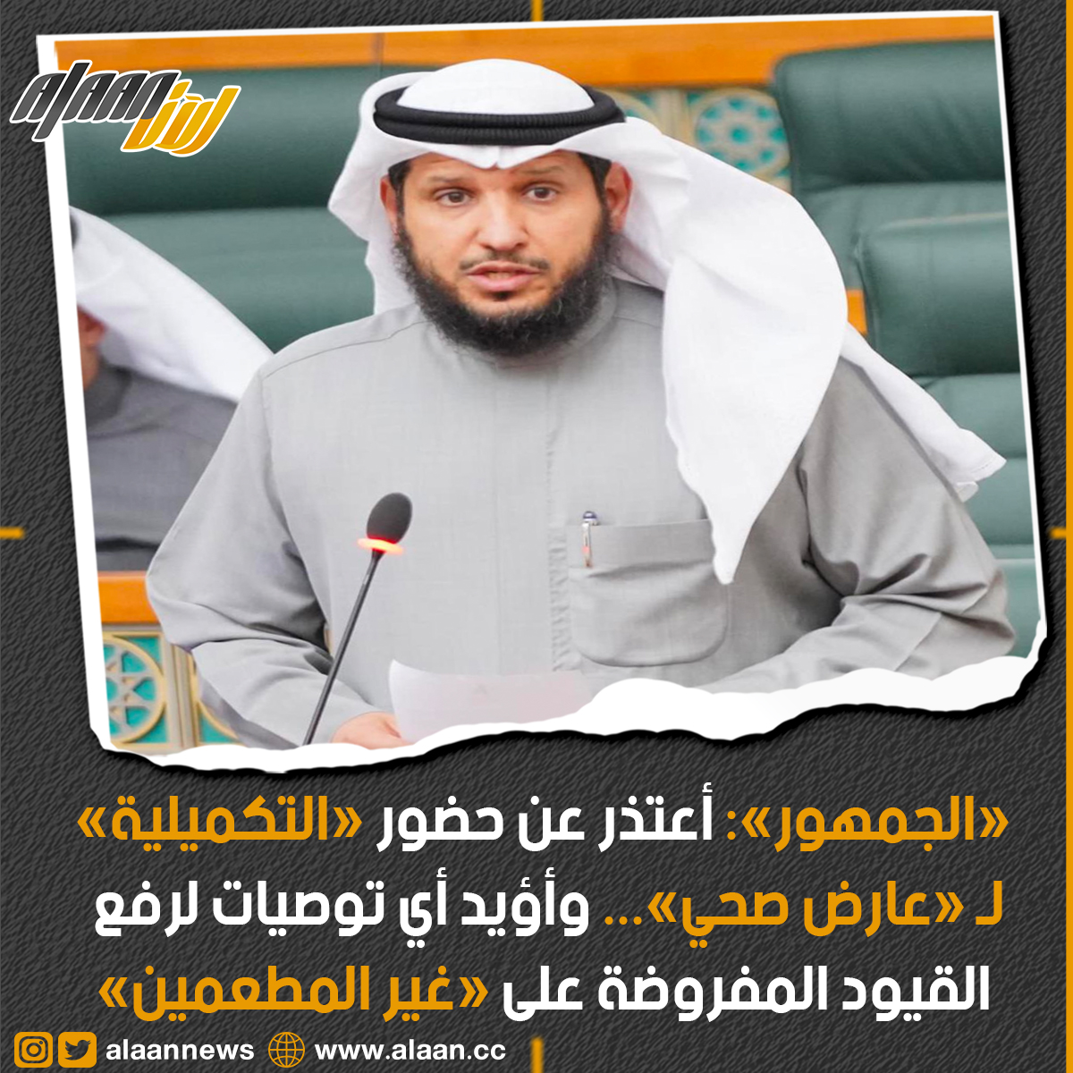 قال النائب فايز الجمهور «أعتذر عن حضور جلسة اليوم للعارض الصحي الذي شعرت به وتعذر حضوري الجلسة، مؤكدا أنني مع أي توصيات لرفع القيود المفروضة على إخواننا غير المطعمين وخصوصا أننى أحد مقدمي اقتراح إلغاء القيود وخاصة السفر».