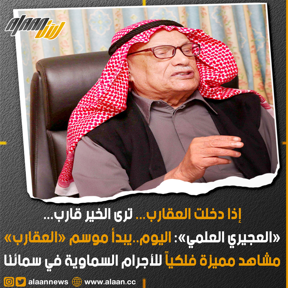 قال مركز العجيري العلمي إن مواسم الشتاء وفق حساب تقويم العجيري لاتزال مستمرة ويبدأ اليوم الخميس موسم (العقارب) ويعد الثالث في فصل الشتاء بالكويت وآخرها وفق التسلسل الزمني للتقويم الفلكي (المربعانية ـ الشبط ـ العقارب).