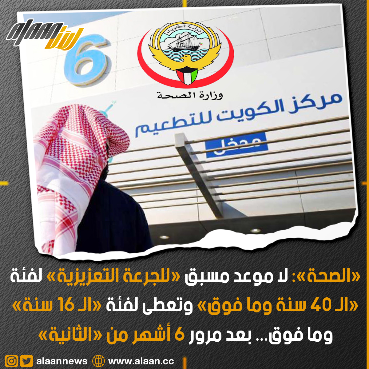 أعلنت وزارة الصحة عن تقديم الجرعة التعزيزية «الثالثة» من لقاح كوفيد-19 للفئة العمرية 40 سنة وما فوق دون موعد مسبق، وذلك في جميع مراكز ومواقع التطعيم.