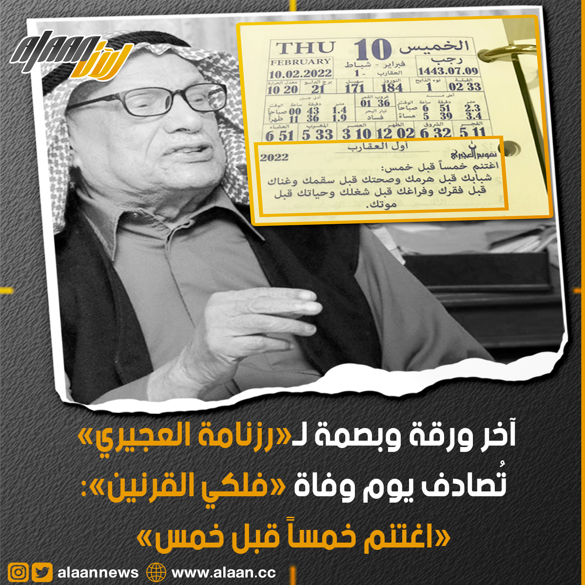 في مُصادفة لافتة وبعد 102 عامًا آخر أوراق وبصمات رزنامة "صالح العجيري": «اغتنم خمسًا قبل خمس»