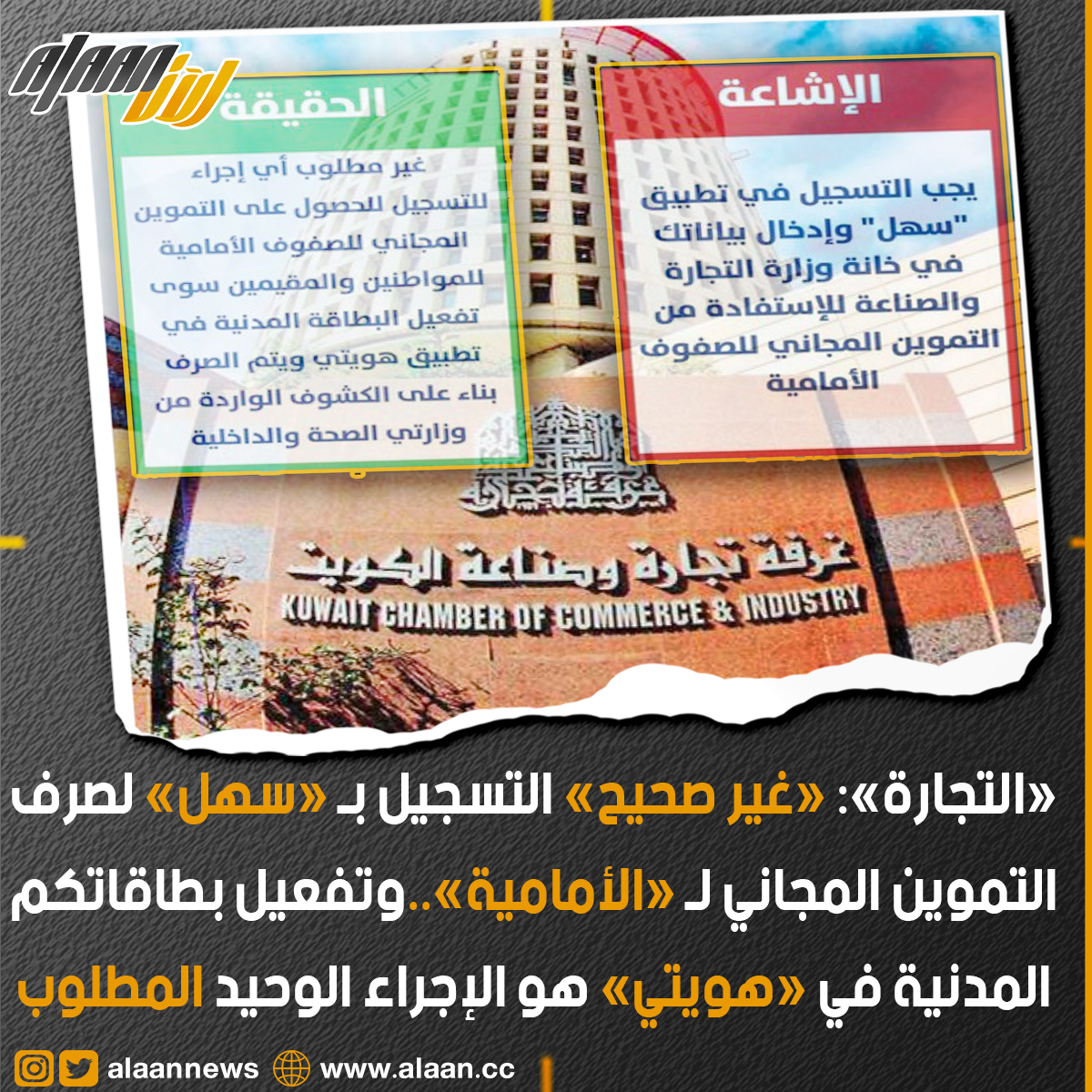 أعلنت وزارة التجارة والصناعة أن ما يتم تداوله بشأن ضرورة التسجيل في تطبيق سهل الحكومي وإدخال البيانات في خانة وزارة التجارة والصناعة للاستفادة من التموين المجاني للصفوف الأمامية غير صحيح .
