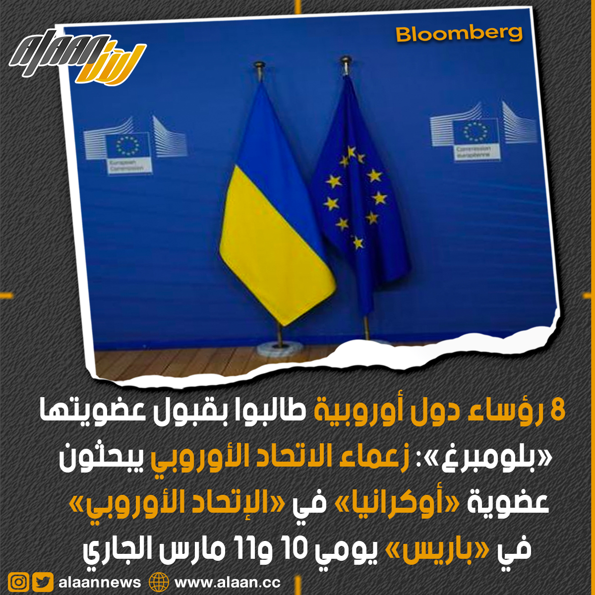 أعلنت وكالة "بلومبرغ" الأمريكية نقلا عن مصدر مطلع، أن زعماء دول الاتحاد الأوروبي سيبحثون عضوية أوكرانيا في الاتحاد في قمة سيعقدونها في باريس يومي الـ10 والـ11 من مارس الجاري.