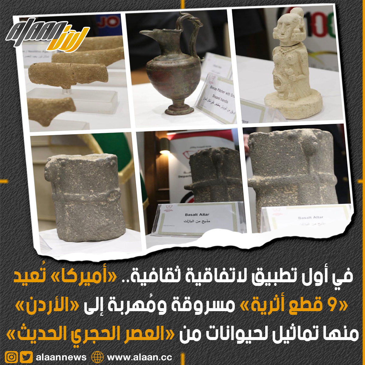 استعادت السلطات الأردنية 9 قطع أثرية هرّبت إلى الولايات المتحدة بينها تماثيل لحيوانات من العصر الحجري الحديث، ومذبح حجر نحاسي، وشواهد قبور، وتمثال بشري