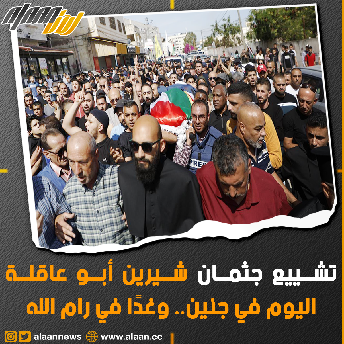 وكانت قد شيعت جماهير غفيرة في جنين، جثمان الشهيدة الصحفية شيرين أبو عاقلة، ومن ثم نقل جثمانها لاحقًا إلى مدينة رام الله، حيث ستلقى عليها نظرة الوداع في مكتب قناة الجزيرة، فيما من المتوقع أن تنقل الجثمان لاحقا إلى القدس لتشييعها لدى عائلتها.