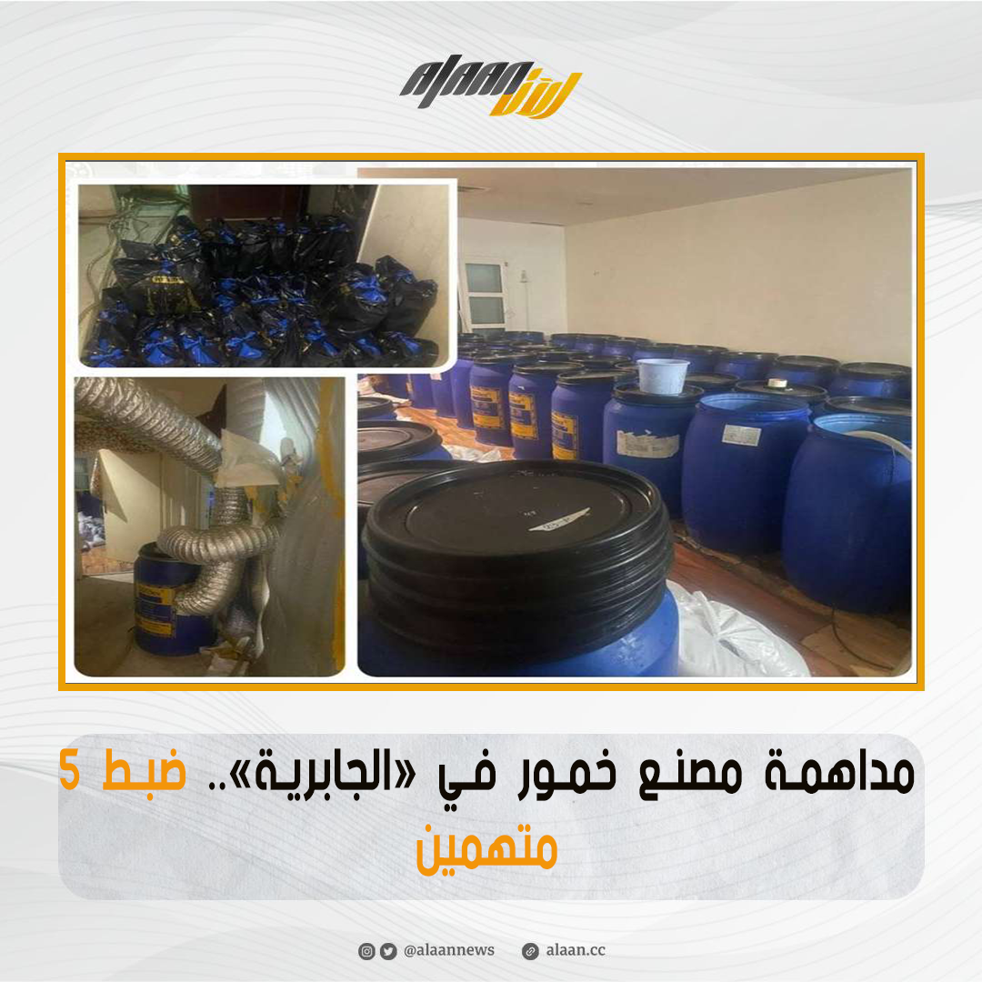 دهم قطاع الأمن الجنائي ممثلاً في قسم مباحث الجابرية مصنع خمور، وضبط 5 أشخاص يديرونه وبحوزتهم عدد كبير من زجاجات الخمور المعدة للبيع.