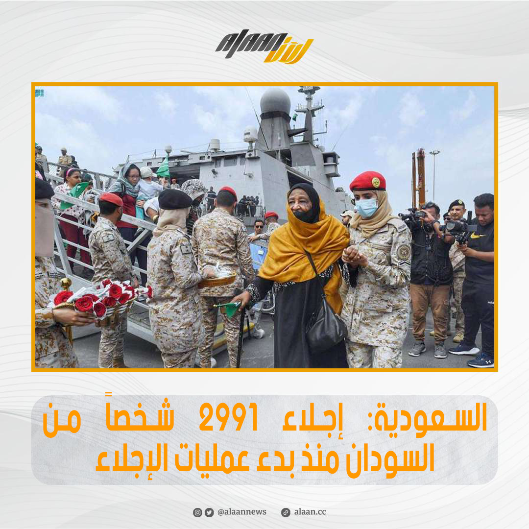 أعلنت وزارة الخارجية السعودي إجلاء 2991 شخصاً من السودان منذ بدء عمليات الإجلاء، لافتة إلى نقل 195 شخصاً صباح اليوم.