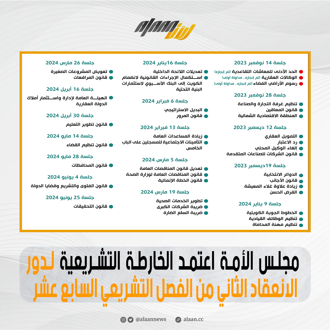 ووزعت التشريعات اللي تضمنتها الخارطة التشريعية على جلسات مجلس الأمة كالاتي: