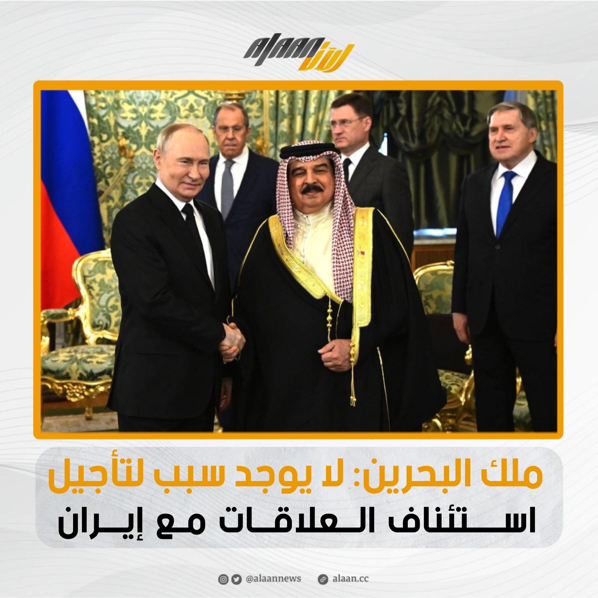 ونقلت وكالة أنباء البحرين «بنا» عن الملك حمد بن عيسى القول خلال لقاء مع الرئيس الروسي فلاديمير بوتين في الكرملين إن «المملكة تتطلع إلى تحسين علاقاتها مع إيران».